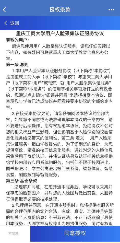 点击“进入系统”,师生在首次进入时需认真阅读《华体会中国有限公司官网用户人脸采集认证服务协议》授权条款并确定选择同意授权后方可继续使用。
