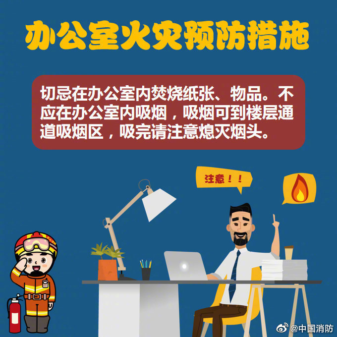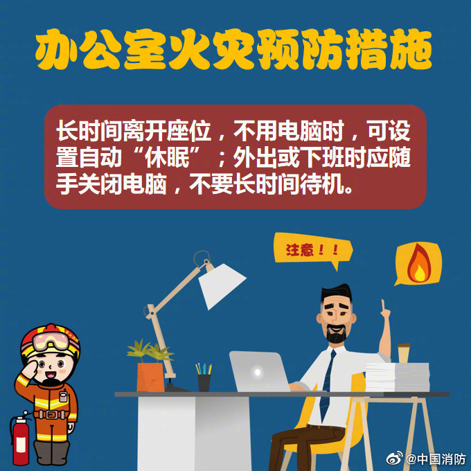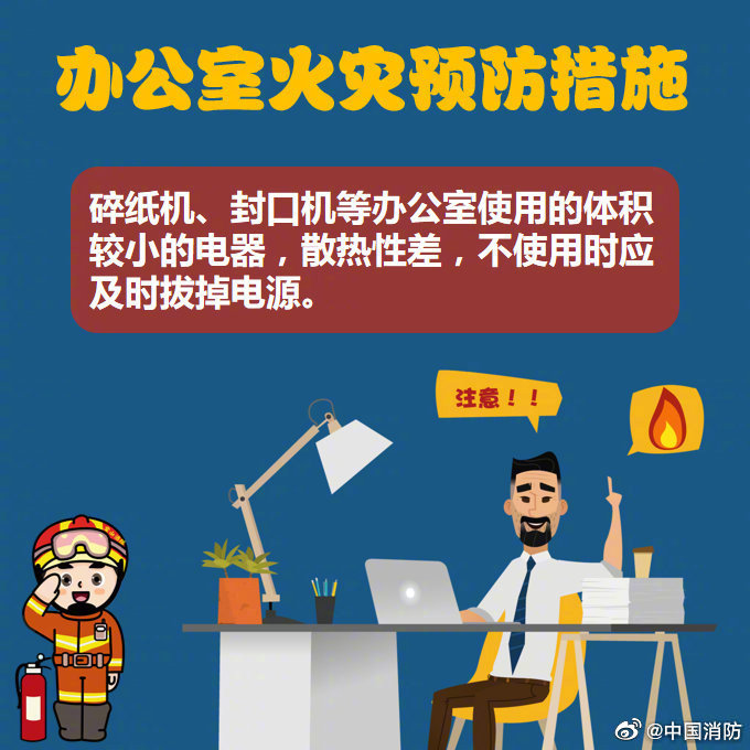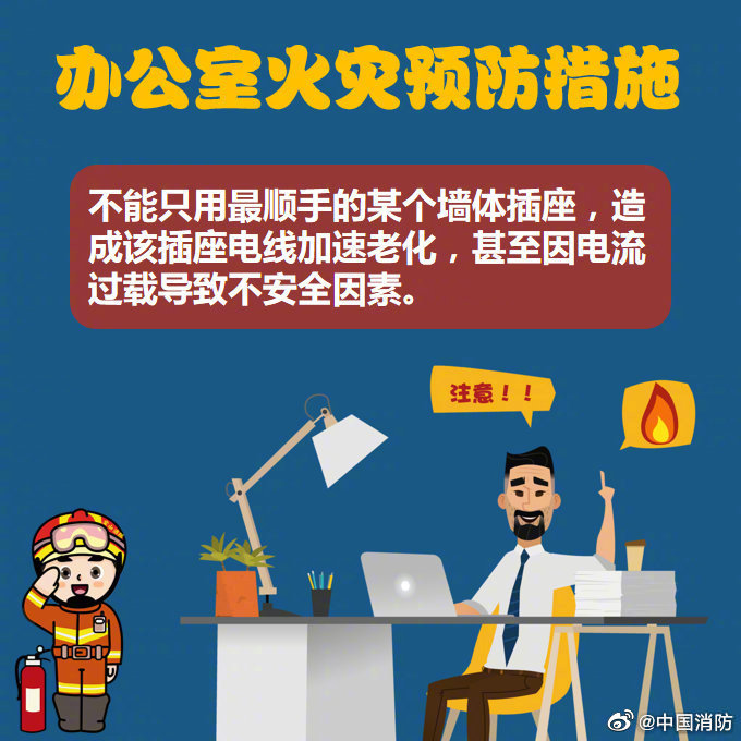 办公室是人员密集场所,电器设备较多,电脑、空调、打印机全都集中在这里。这些设备每天都在不停地运转,给办公室的用电量带来极大的负担。因此,一定要重视办公室的消防安全,定期排查隐患,防患于未“燃”。