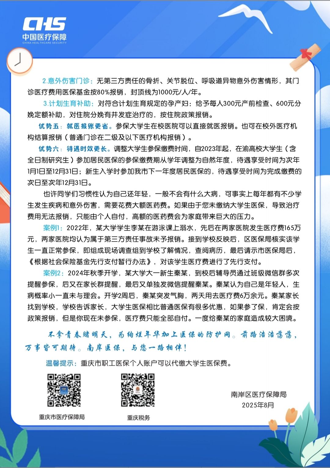 按照《国务院办公厅关于健全基本医疗保险参保长效机制的指导意见》(国办发〔2024〕38号)和《国家发展改革委办公厅等关于进一步提高高校学生医疗保障质量的通知》(发改办就业〔2024〕1096号)有关要求,根据重庆市医疗保障局、重庆市教育委员会、重庆市财政局、国家税务总局重庆市税务局联合发布的《关于做好大学生参加基本医疗保险相关工作的通知》(渝医保发〔2024〕31号)文件精神,为进一步做好我校学生的医疗保障工作,现将2026年大学生参保政策解读如下: