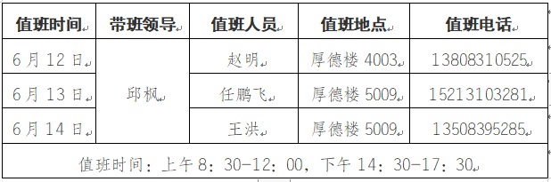 为更好地服务全校师生,保障端午节期间学校校章、党委印章、法人印章、学校合同章、党政办公室印章等用印,学校介绍信开具,公文签发审核,会议室申请及使用等工作顺利开展,现将值班安排公布如下,请需求单位或师生按规定流程履行签批手续。