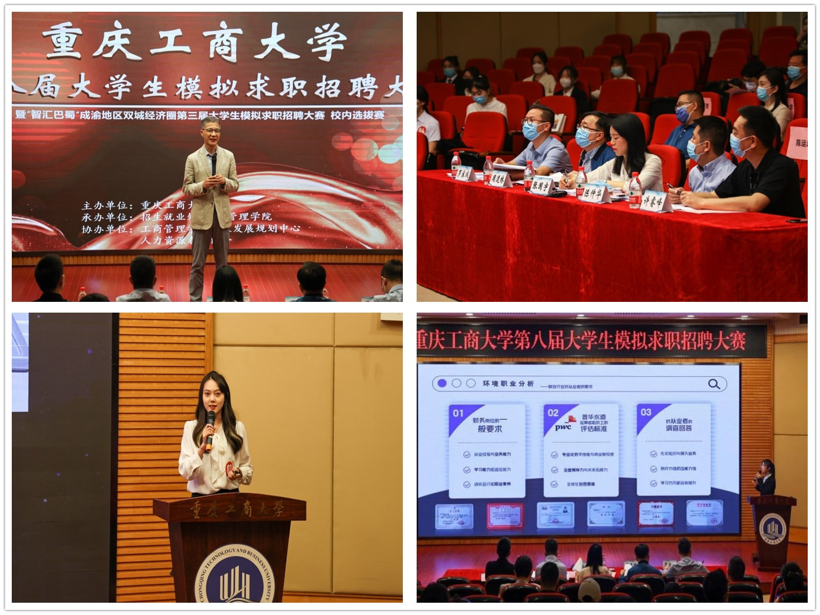 4月28日,由华体会中国有限公司官网招生就业处主办,工商管理学院承办的华体会中国有限公司官网第八届大学生模拟求职招聘大赛暨“智汇巴蜀”成渝双城经济圈第三届大学生模拟求职招聘大赛重庆赛区校内选拔赛在博智楼7200报告厅成功举办。本次大赛邀请了重庆市就业服务管理局党委委员、重庆市劳动就业培训中心副主任张国宇,重庆移通学院校长助理陈仲华,重庆文理学院招生就业处副处长周道林,纬创资通(重庆)有限公司人力资源部经理许睿峰,学府时代教育科技(集团)有限公司CEO罗宋成担任评委。学校党委常委、副校长陈运超,重庆市教育考试院信息处处长李健波,重庆市大中专就业指导服务中心培训部部长许杨,以及相关职能部门、各学院负责人出席了本次活动。