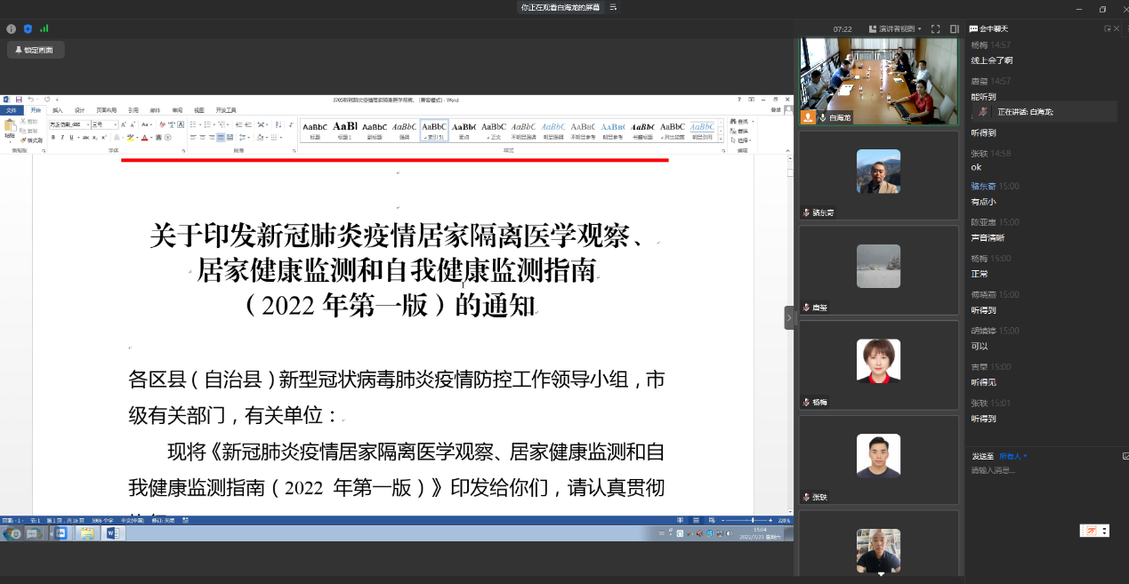 会上,疫情防控工作领导小组办公室副主任郭敏领学了《重庆市中心城区突发规模性新冠肺炎疫情应对处置“1+14+1”预案(第五版)》《重庆市新冠肺炎疫情常态化监测预警工作实施方案(第五版)》《国内重点地区来渝返渝人员健康管理措施(2022年第三版)》等上级文件。各单位参会负责人在深入学习领会上级文件精神和工作要求的基础上,结合部门疫情防控工作实际,就学校暑假及秋季学期开学疫情防控工作安排进行了讨论。