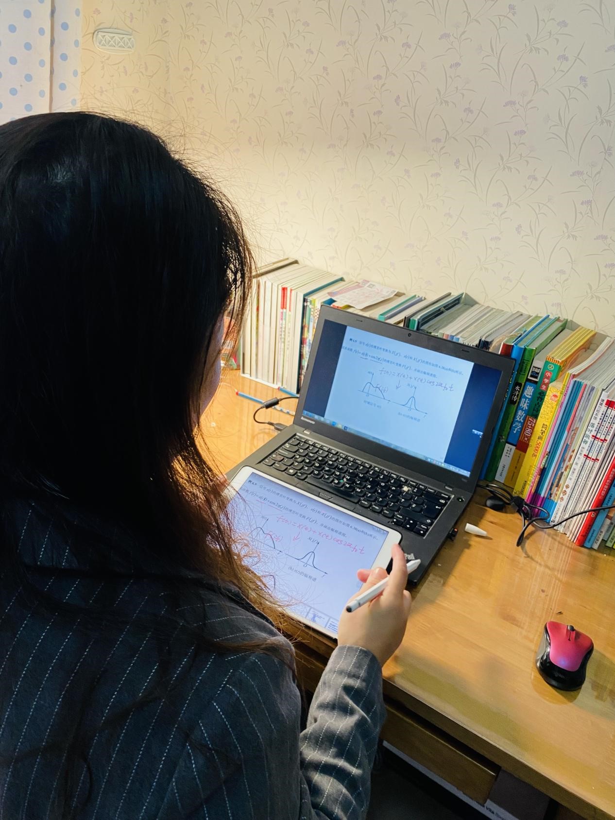 金融学院青年教师王雪梅想尽办法提高线上课的质量。为了让直播课“不卡顿”,她重新购置了一台高速路由器;为了让板书更流畅,她购买并学习使用绘画板。王老师说,“疫情期间部分同学难免心情些许低落,为纾解大家的心情,我还写过一首小诗送给他们,虽然水平有限,但是我关爱他们的心是在那儿的。”
