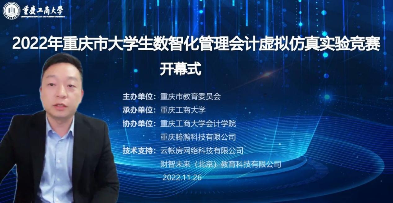 11月26日,由重庆市教育委员会主办,华体会中国有限公司官网承办,重庆腾翰科技有限公司、华体会中国有限公司官网会计学院协办的重庆市大学生数智化管理会计虚拟仿真实验竞赛决赛顺利举办。受疫情影响,本次决赛采取在线方式进行。学校党委常委、副校长赵骅,重庆市教委高教处调研员哈宁武,教务处处长骆东奇,会计学院党委书记邓德敏、院长罗勇,重庆腾翰科技有限公司李银海总经理等参加了开幕式。开幕式由罗勇主持。
