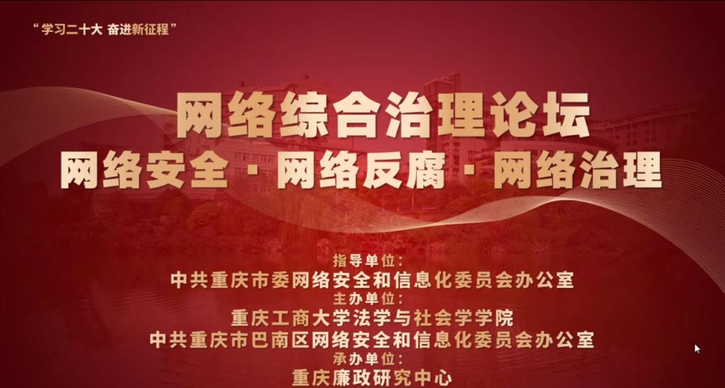 本次论坛大致分为两个阶段。首先,第一阶段由重庆市委网信办协调执法处、网络综合治理处王东处长围绕“重庆市网络综合治理综述”这一主题,分享了整个重庆市网络综合治理的现状、存在的问题与未来发展方向;沙坪坝区委网信办李维主任以“沙坪坝区网络综合治理浅析”为题,介绍了沙坪坝区网络综合治理中的重点、难点及采取的应对措施;西南政法大学法学院梅传强院长从刑法的角度出发,分享了党的二十大中习近平总书记强调的重点问题,即“网络反腐的特点、困境与对策”;重庆邮电大学网络空间安全与信息法学院副院长黄东东重点针对“国际博弈背景下网络安全战略与能力竞争”,从网络空间安全的角度来看网络综合治理问题。最后,由重庆大学法学院黄锡生院长及南岸区委网信办杨雪松主任对上述专家领导的分享与观点作出理论结合实践的精彩点评。