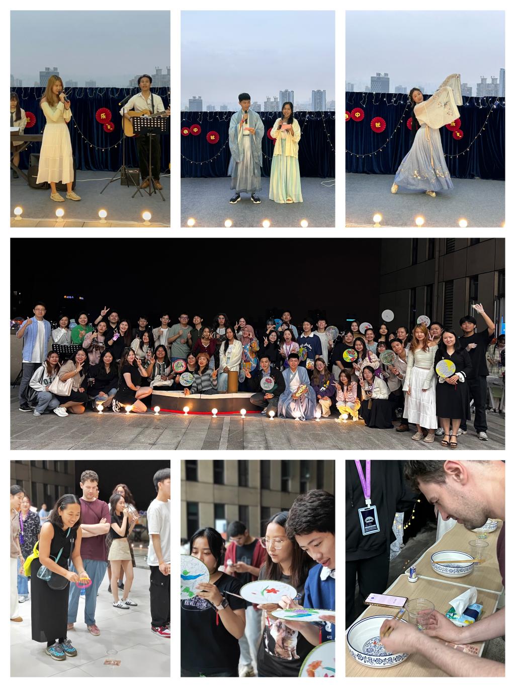 演出结束后是游园环节,外教、留学生在“海底捞月”“汉字套圈”“夹弹珠”等小游戏中尽情感受中华传统文化;游戏的同时,大家还体验了制作冰皮月饼,手绘团扇,拼装花灯等中秋传统文化活动,亲手制作的每一件手工作品都生动地诠释了跨文化的碰撞与融合。