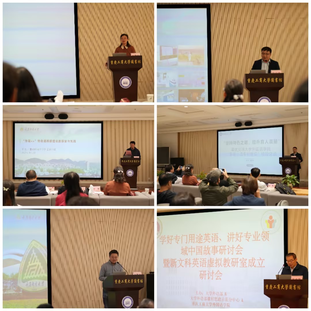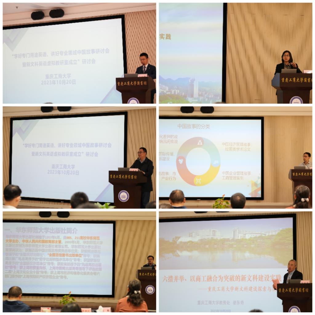 重庆“一带一路”经济技术合作中心理事长兼主任杜小东作了题为《“一带一路”倡议十周年:国际投资与服务贸易的语言支撑》的报告。重庆交通大学外国语学院院长曾洪伟教授以《坚持特色之路,提升育人质量---重庆交通大学外国语学院国家级一流专业建设》为题分享了国家一流专业建设的经验。重庆邮电大学外国语学院王怡博士作了题为《“外语+”特色课程群建设的探索与实践》的汇报。华体会中国有限公司官网外国语学院副院长刘繁以《财经特色 融合创新——大学英语财经课程体系建设》为题分享了大学英语财经课程体系建设经验和成果;我校大学外语部主任罗志高教授讲述了如何用财经专门用途英语讲好中国故事。福建亿学教育科技集团有限公司大西南总监周宗强先生、华东师范大学出版社宜立特教材研发中心副总编朱林民先生分别从产教融合和外语教育课程思政的角度介绍了讲好中国故事教学资源建设。