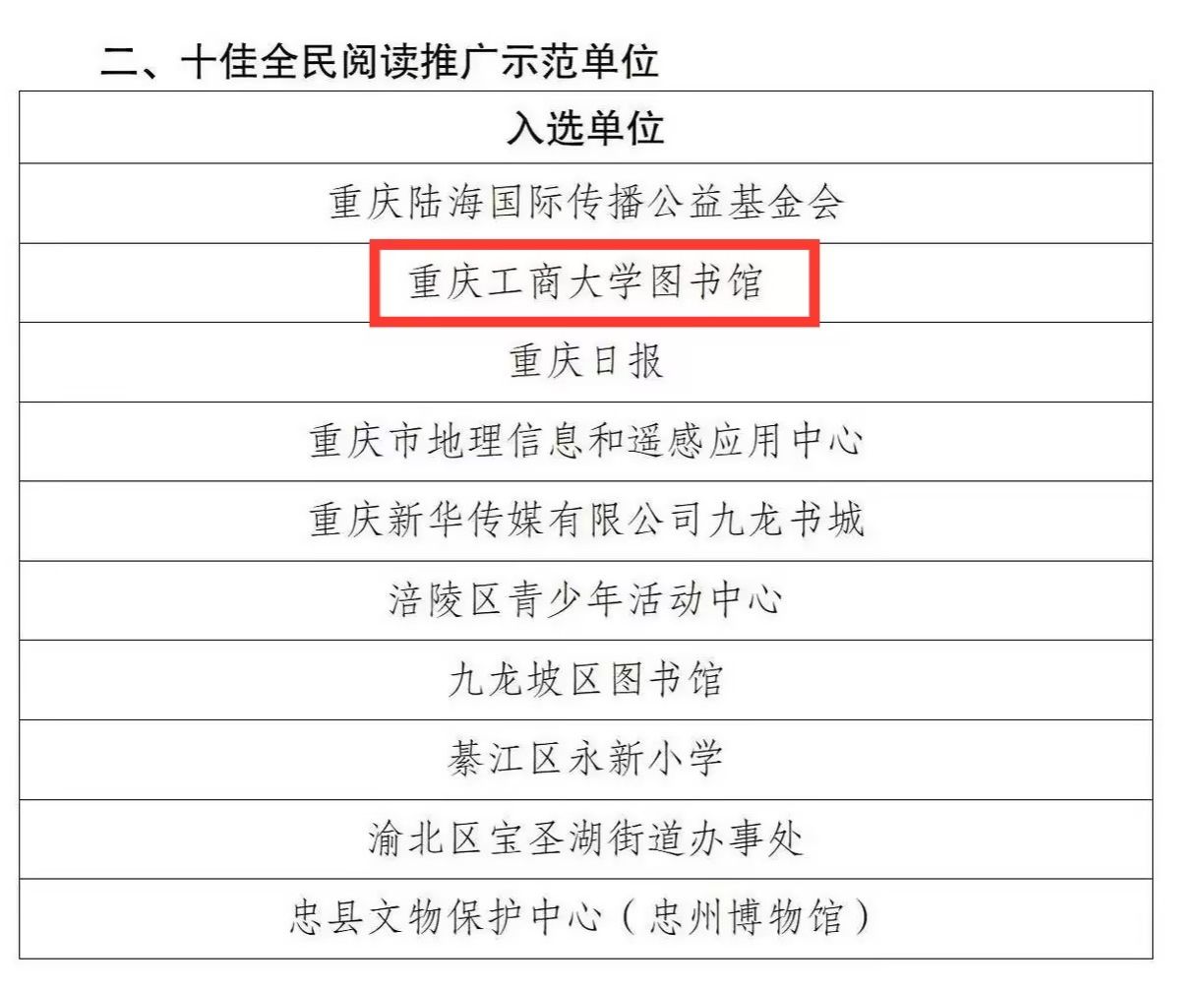 4月10日,2024年“书香重庆·全民阅读盛典”活动在九龙坡区人民政府九龙礼堂举行,我校图书馆继2021年荣获“书香校园”的荣誉之后,再获“十佳阅读推广示范单位”称号。