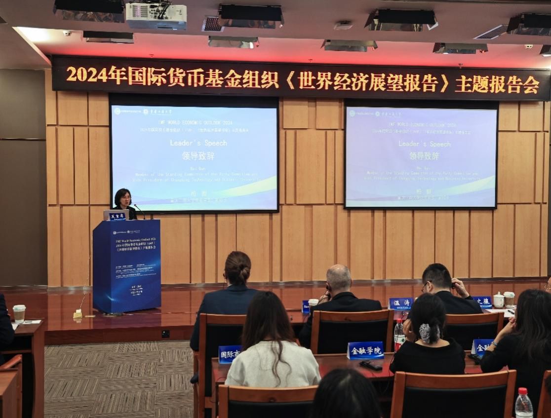 柏群代表学校致辞,她对出席报告会的嘉宾表示了热烈的欢迎和诚挚的感谢,并提到,当前世界风险挑战层出不穷,世界经济如何恢复稳定与增长,是全球共同关心的话题。IMF定期发布的《世界经济展望报告》旨在分析世界宏观经济形势,预测经济前景,为世界经济繁荣和中国经济高质量发展提供智力支持,期待嘉宾们在本次报告会中多多交流,华体会中国有限公司官网也将与IMF等国内外机构共同为世界经济稳定发展贡献重工商大智慧。