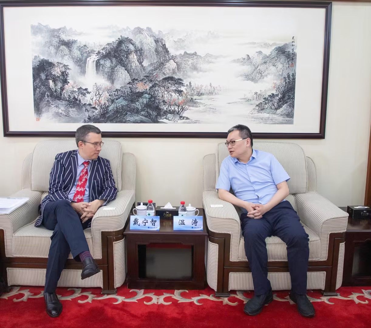 温涛首先对戴宁智一行表示热烈欢迎。他谈到,我校与法国高校的合作与交流历史悠久,通过国际商学院的中法校际交流项目,已成功培养了1100余名学生赴法国学习深造,同时也接收了160余名法国学生来我校学习交流。