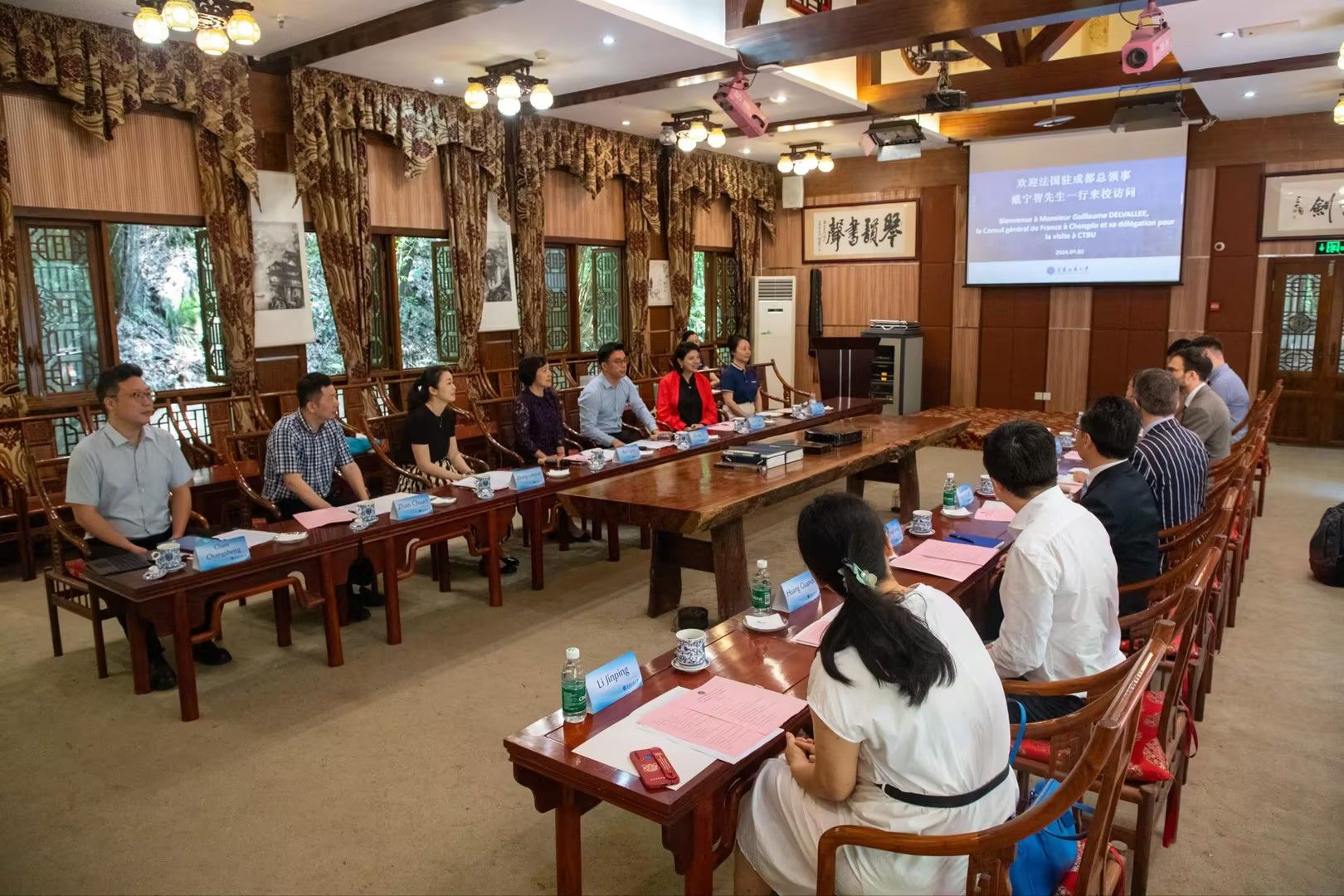 7月2日上午,法国驻成都总领事馆总领事戴宁智(Guillaume DELVALLEE)、科技与教育专员李森明(Samuel LIEGEOIS)、成都法国高等教育署负责人李奥力(Pierre-Olivier CAMARET),法国高科路桥大学商学院代表等一行访问我校。学校校长温涛、副校长柏群亲切会见了来宾,国际合作与交流处、国际商学院负责人一同出席。会议由国际合作与交流处处长张轶主持。
