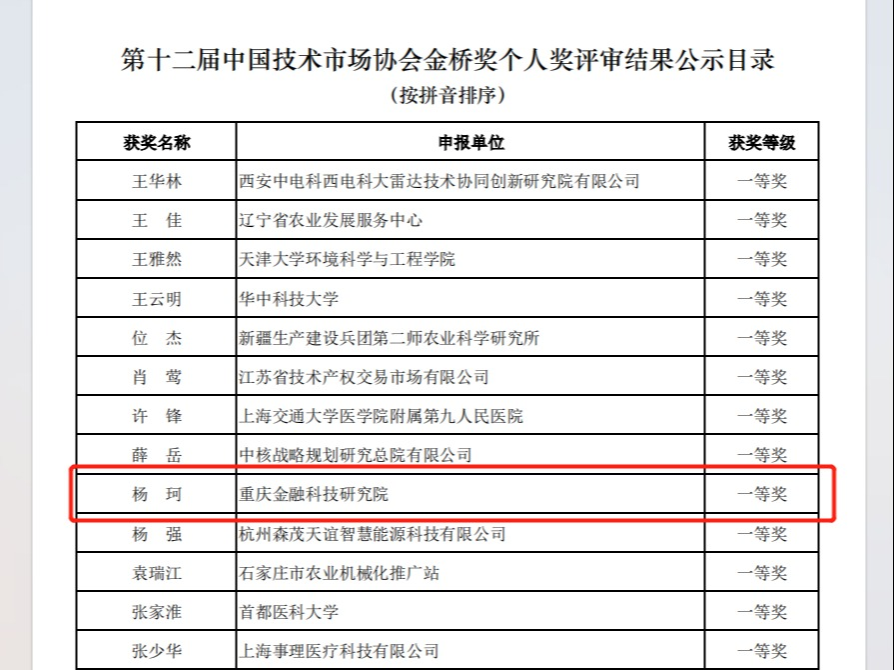 第十二届中国技术市场协会金桥奖评审结果揭晓,我校重庆金融科技研究院副院长杨珂获个人奖一等奖。