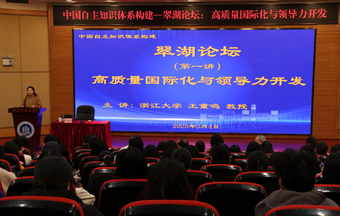 3月4日,“翠湖论坛”第一讲在南岸校区博智楼7200会议室开讲。浙江大学文科资深教授、浙江省特级专家、浙江大学全球创业研究中心主任王重鸣教授应邀来我校作了题为“高质量国际化与领导力开发”的专题讲座。来自工商管理学院、会计学院的200多名师生参加讲座,讲座由学校党委常委、副校长任毅教授主持。