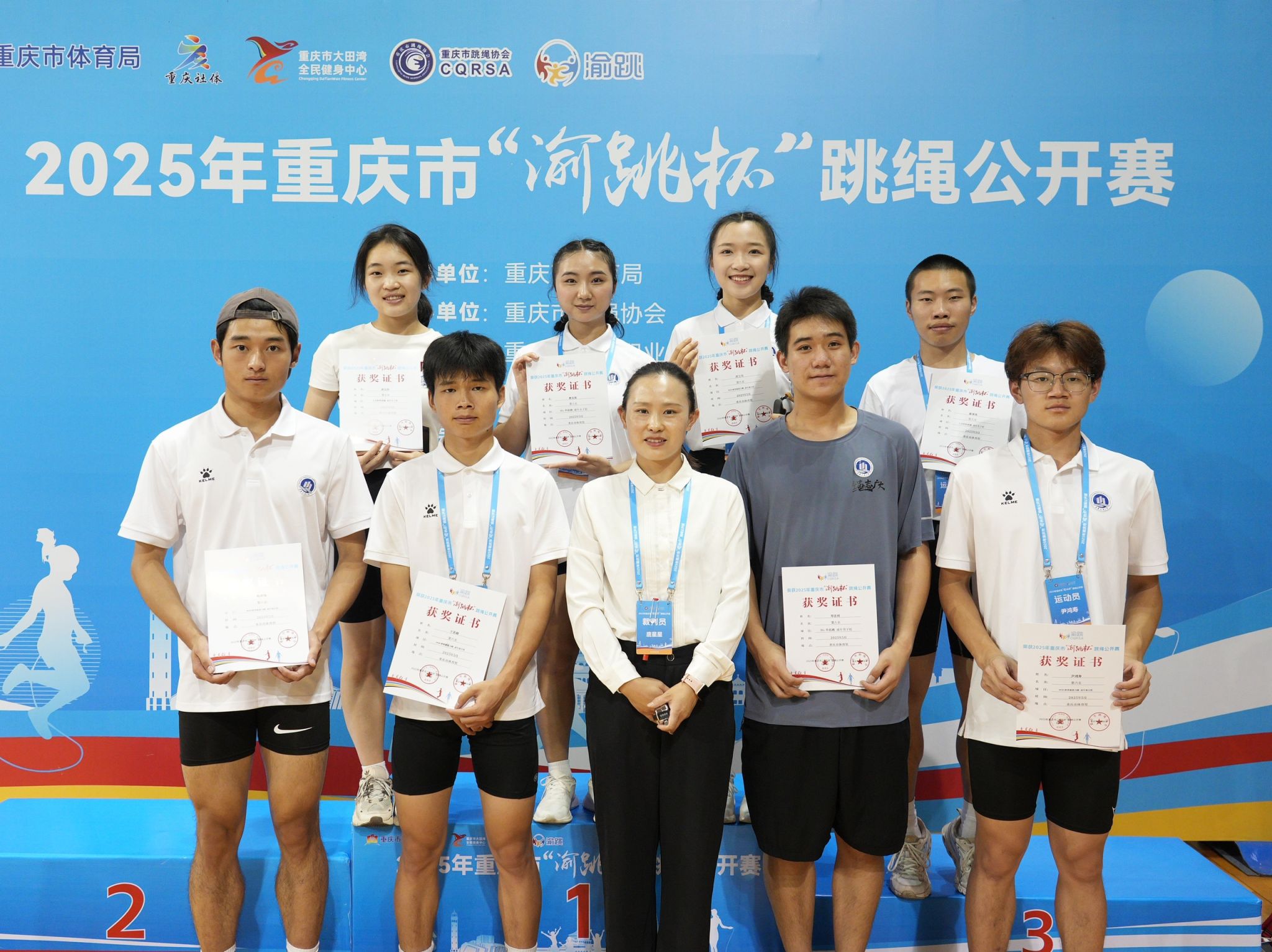 跳绳队作为学校的特色体育队伍,此次比赛由学校体育学院唐星星老师带队,跳绳队一举夺得5项冠军、5项季军、3项第六名、1项第七名和2项第八名的优异成绩。其中,我校选手编排创新、节奏精准,在个人速度赛、个人花样赛、团体花样赛等项目中表现尤为亮眼,包揽多项冠军。
