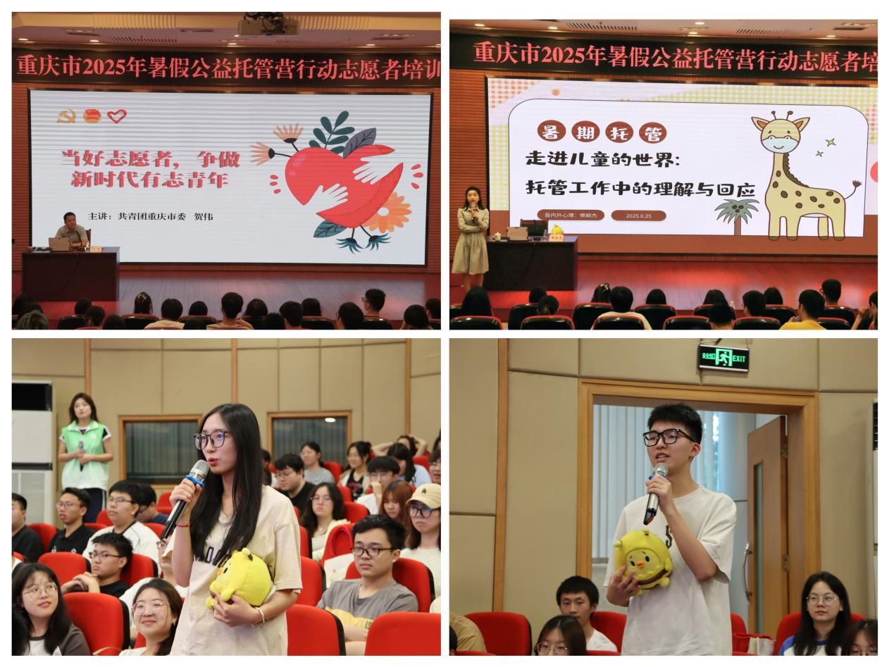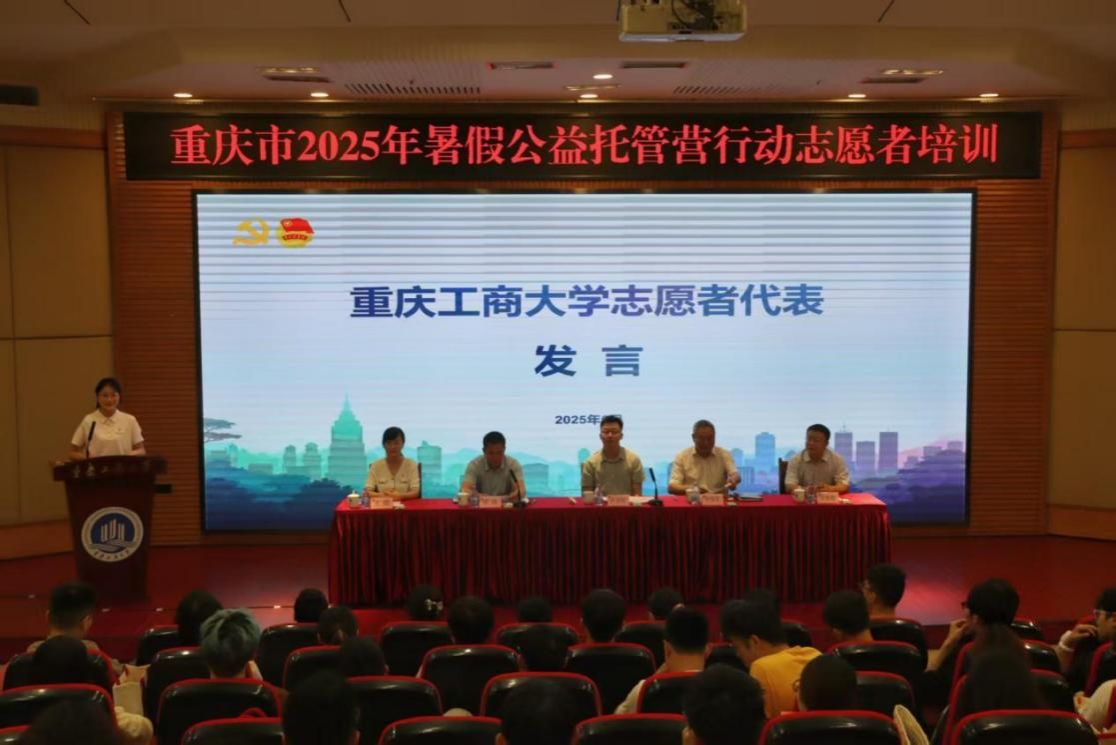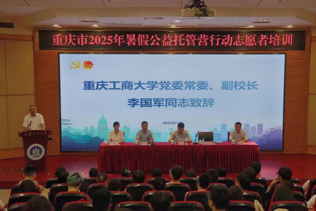 为深入贯彻落实习近平总书记视察重庆重要讲话重要指示精神,贯彻落实市委六届六次全会部署,加快全市域青年发展型城市建设,切实把“假期公益托管营”行动办实办好,6月25日上午,重庆市2025年暑假公益托管营行动志愿者培训在我校南岸校区博智楼7200报告厅开班。共青团重庆市委副书记许克松,党委常委、副校长李国军,重庆市志愿服务指导中心党支部副书记贺伟,校团委书记吴佑波、副书记王微出席培训开班仪式。来自重庆交通大学、重庆理工大学、重庆第二师范学院和我校的300余名志愿者代表集中参训。