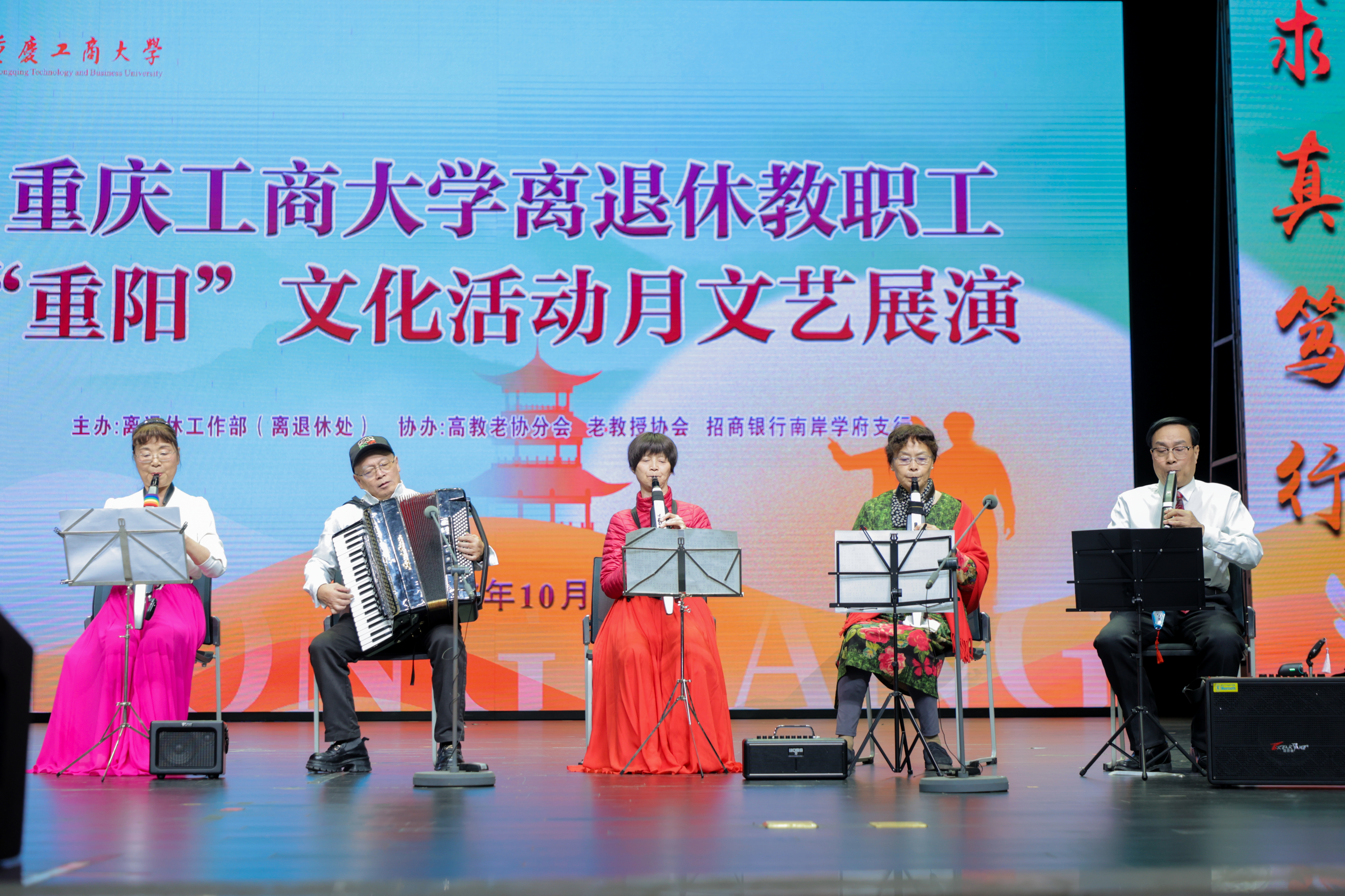 学校党委常委、副校长田双全,党委常委、党委组织部部长莫征,党委离退休工作部部长、离退处处长刘代成,国内合作发展处处长郭敏,党委宣传部副部长田庆刚,招商银行南岸学府支行行长杨紫娟到场与300余名离退休教职工一同观看演出。