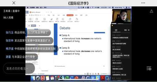 经济学院在线教学亮点纷呈,准备充足,深入浅出,学生们听得津津有味,互动性高。谢新教授采用全英文授课,体现了高水平学者的风范;黄潇副院长通过小故事视频导入,开启同学们对经济博弈论的兴趣;杨军教授和刘晗老师分别在“政治经济学”和“微观经济学”课程中有机融入课程思政元素,每堂课都是一堂课堂思政。张桂君、敬震海等老师在教学中设计了很多启发式、讨论式问题,鼓励同学们用弹幕的形式回答问题,得到了积极响应;黄玲、杨立卓老师通过输入文字+发言进行互动,让学生的精力随时集中在听课内容上;杨海丽老师准备充分,商品学课程互动性高,同学们反响极高;何泱泱、王希晨等老师为全英文课程设计了有趣的互动环节,同学们积极主动去研究每一页课件的内容,学习效果好。新教师赖辉备课非常充分,以中国和双层经济圈案例导入课程,通俗易懂,学生兴趣高。