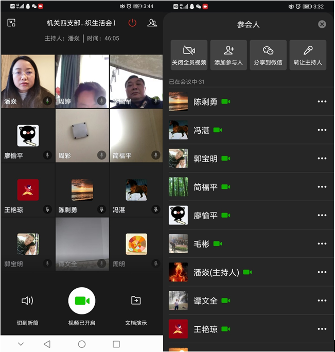 2020年3月3日下午,机关党委第四党支部新学期第一次网络视频支部党员大会在企业微信群顺利召开。会议由支部书记潘焱主持,包括李国军副校长在内的支部全体31名党员全部线上参会。
