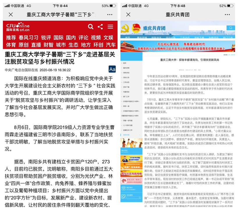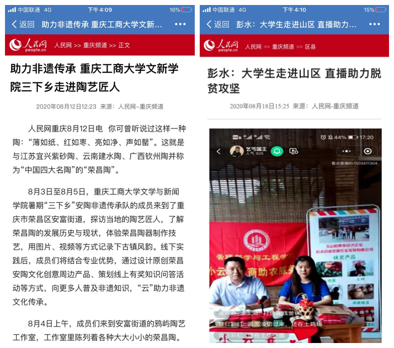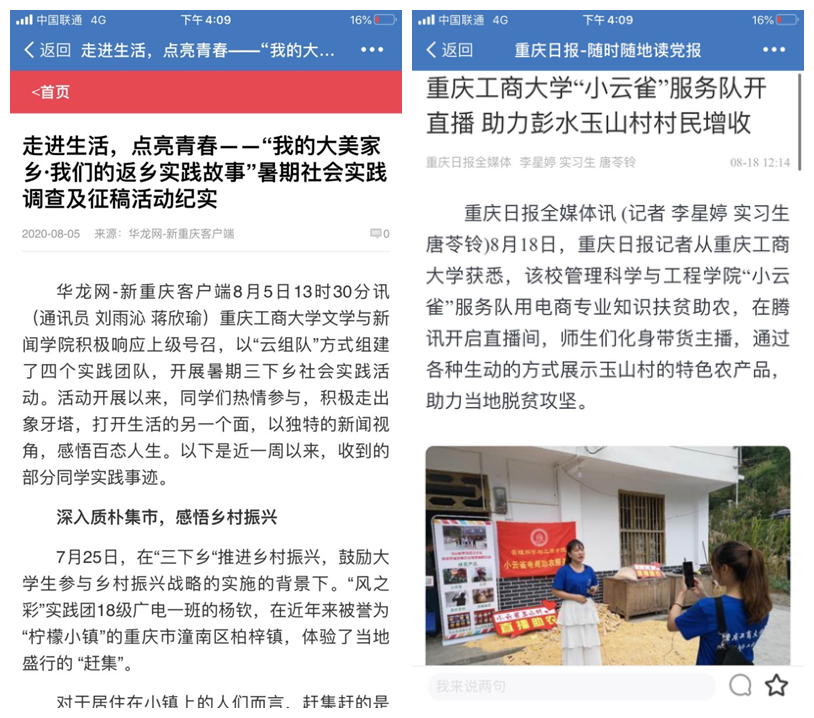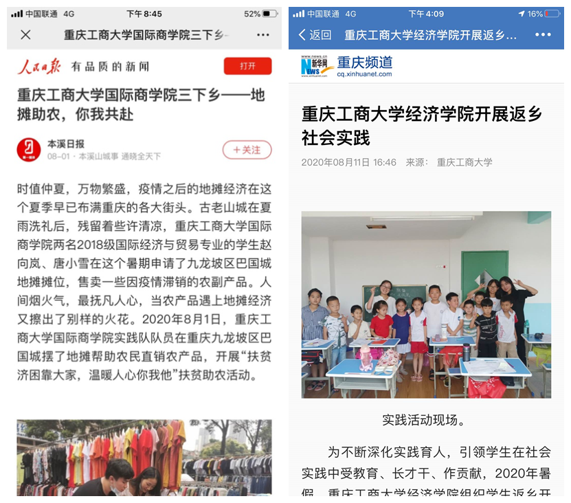 我校本次暑期社会实践覆盖全校19个学院,各学院实践队伍开设多种实践课程,形成多篇高质量调研报告和优秀文化作品,如《华体会中国有限公司官网学子:青春之花绽于理想,脱贫之果结于家乡》、《没有生而英勇,只有选择无畏——国际商学院三下乡活动抗疫温暖》、《管理科学与工程学院:大学生走进山区,直播助力脱贫攻坚》等优秀三下乡社会实践调研作品,扎实推动习近平新时代中国特色社会主义思想在基层普及,广泛宣传了国家方针政策,充分践行了“不忘初心,牢记使命”的教育,发扬了“不怕吃苦,躬身实践”的志愿精神,为乡村振兴贡献了青春力量,不仅获得了当地政府、社会的认可,同时也被《人民日报》、《新华网》、《人民网》、《中国青年网》、《共青团中央服务青年发展部微信平台》、《中央广电总台国际在线》、《重庆共青团》官方网站、《重庆市教委官方微信平台》、《华龙网》、《重庆日报》、《彭水手机台》等多家媒体报道。