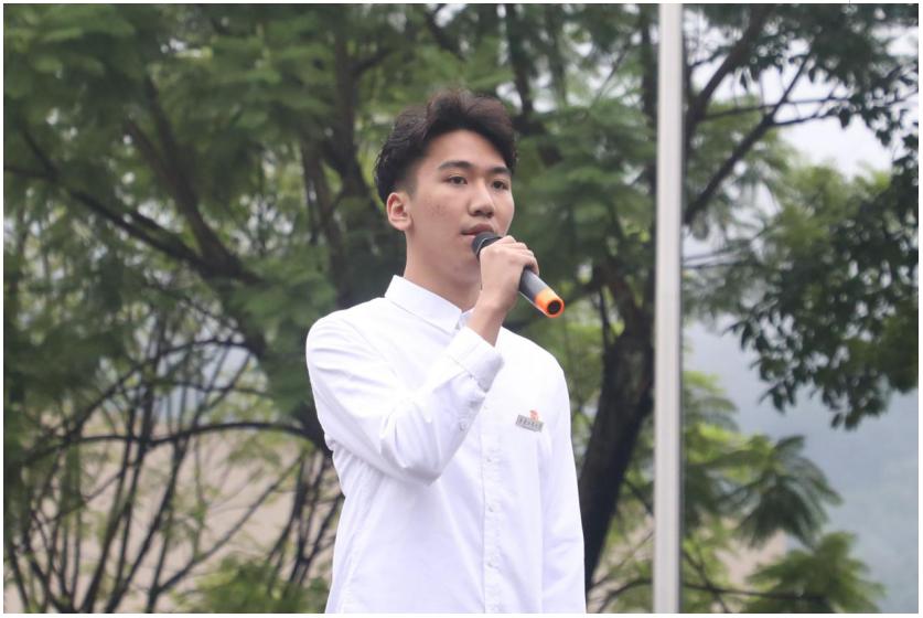 升旗仪式完毕后,学生代表、会计学院2018级财务管理专业、湖北武汉籍学生贺心怡发言。她讲述了在武汉抗疫中的感悟,表示家国情怀是将我们所有人凝聚在一起的朴素的行为和情感,家国是伟大的信念和力量。接着,国际商学院2018级国际经济与贸易一班的刘星驿同学发言,他讲述了自己在重庆防汛抗洪中义无反顾加入南滨路清淤志愿队的故事,他表示责任在肩,义不容辞,当国家和人民需要我们的时候,就应该勇敢的站出来,扛起属于青年的那一份责任。