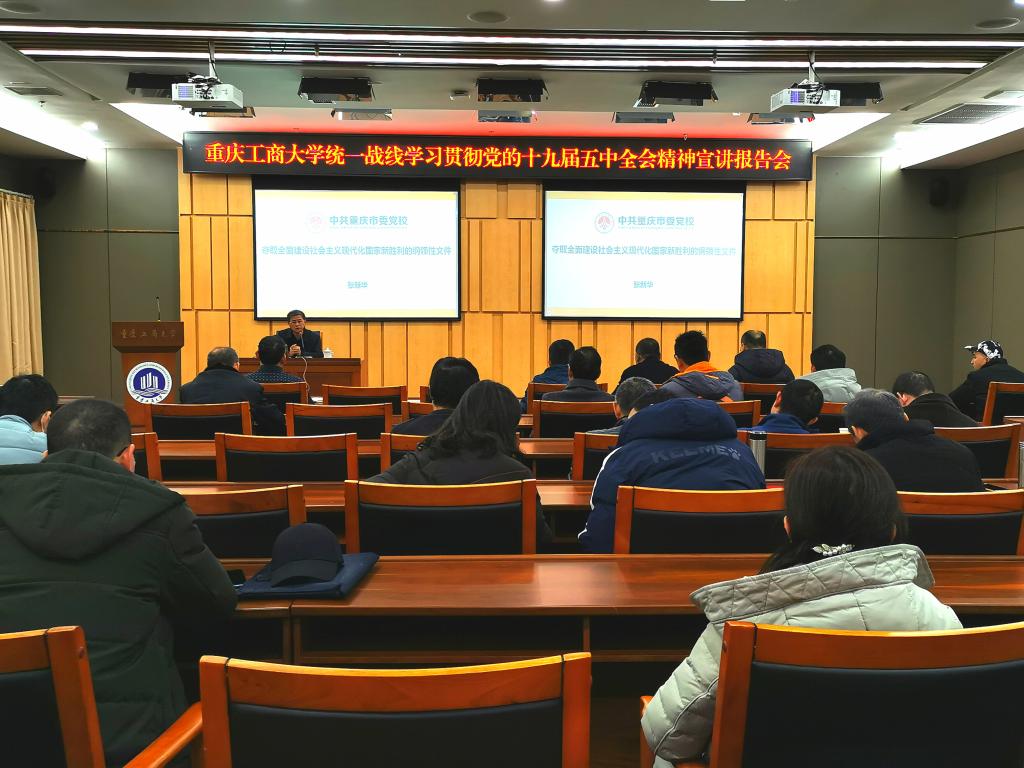 按照《华体会中国有限公司官网学习宣传贯彻党的十九届五中全会精神工作方案》(重工商大委【2020】97号)相关要求,12月17日下午,学校在新图书馆会议中心一会议室举办统一战线学习贯彻党的十九届五中全会精神宣讲报告会,邀请中共重庆市委党校(重庆行政学院)张新华教授作宣讲报告。学校党委统战部常务副部长陈松主持宣讲报告会。学校非中共党员的市、区人大代表、政协委员,民主党派市委委员、区委主委(副主委),各民主党派基层组织和统战团体的领导班子、成员代表以及党委统战部干部,共计60余人参加了报告会。