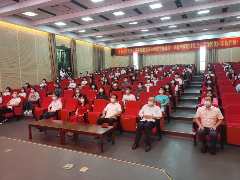 报告厅内,全体党员师生佩戴党徽,心潮澎湃地观看直播,场内不时响起阵阵掌声,气氛热烈。