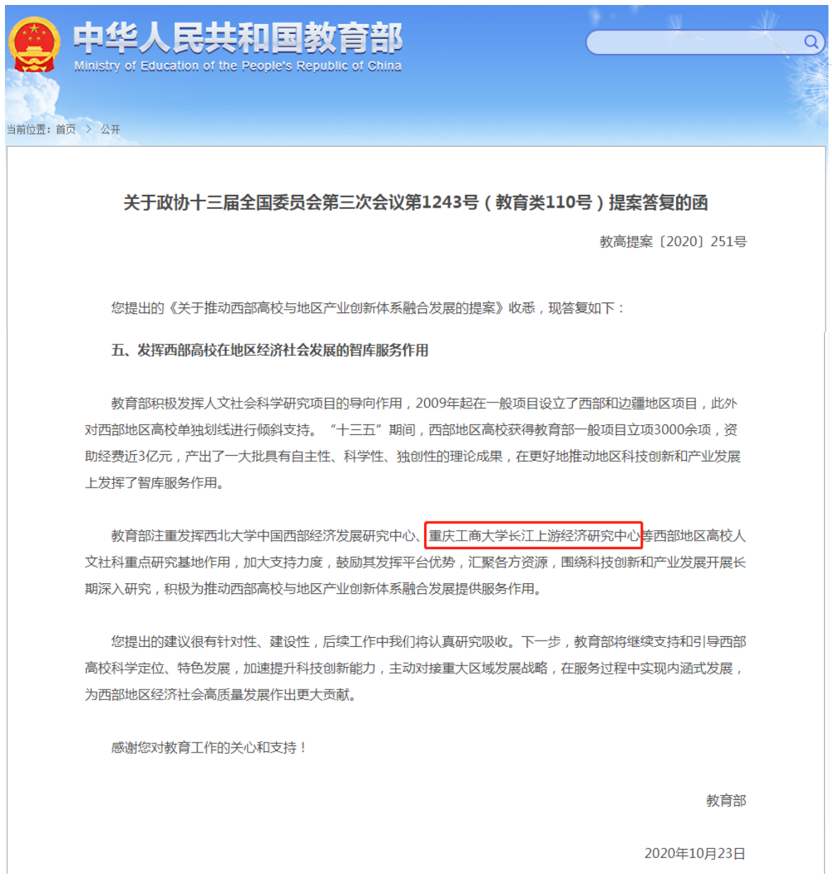 去年底,教育部《关于政协十三届全国委员会第三次会议第1243号(教育类110号)提案答复的函》(教高提案〔2020〕251号)中专门指出:“教育部注重发挥……华体会中国有限公司官网长江上游经济研究中心等西部地区高校人文社科重点研究基地作用,加大支持力度,鼓励其发挥平台优势,汇聚各方资源,围绕科技创新和产业发展开展长期深入研究,积极为推动西部高校与地区产业创新体系融合发展提供服务作用”。