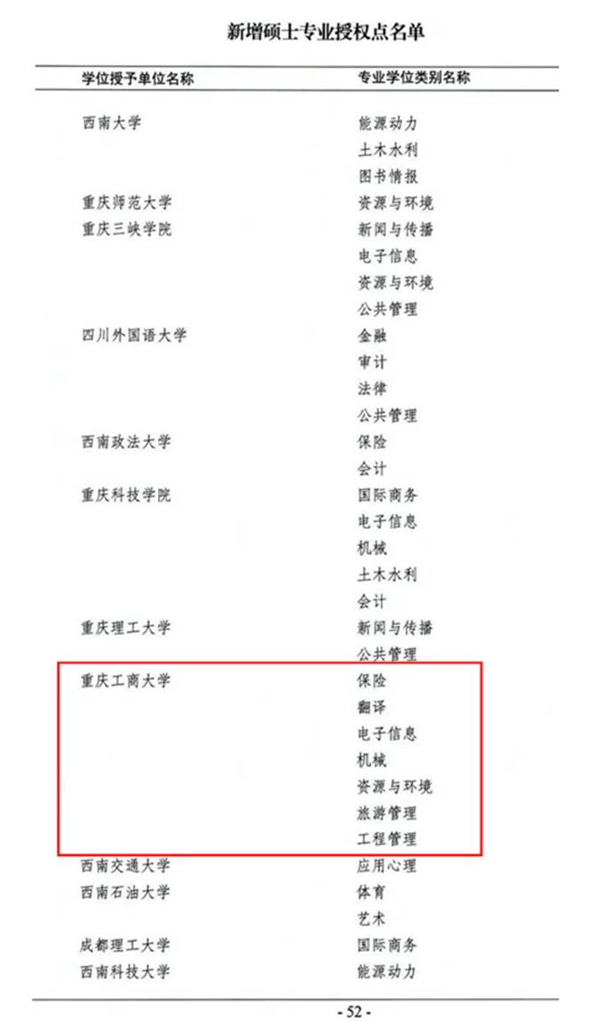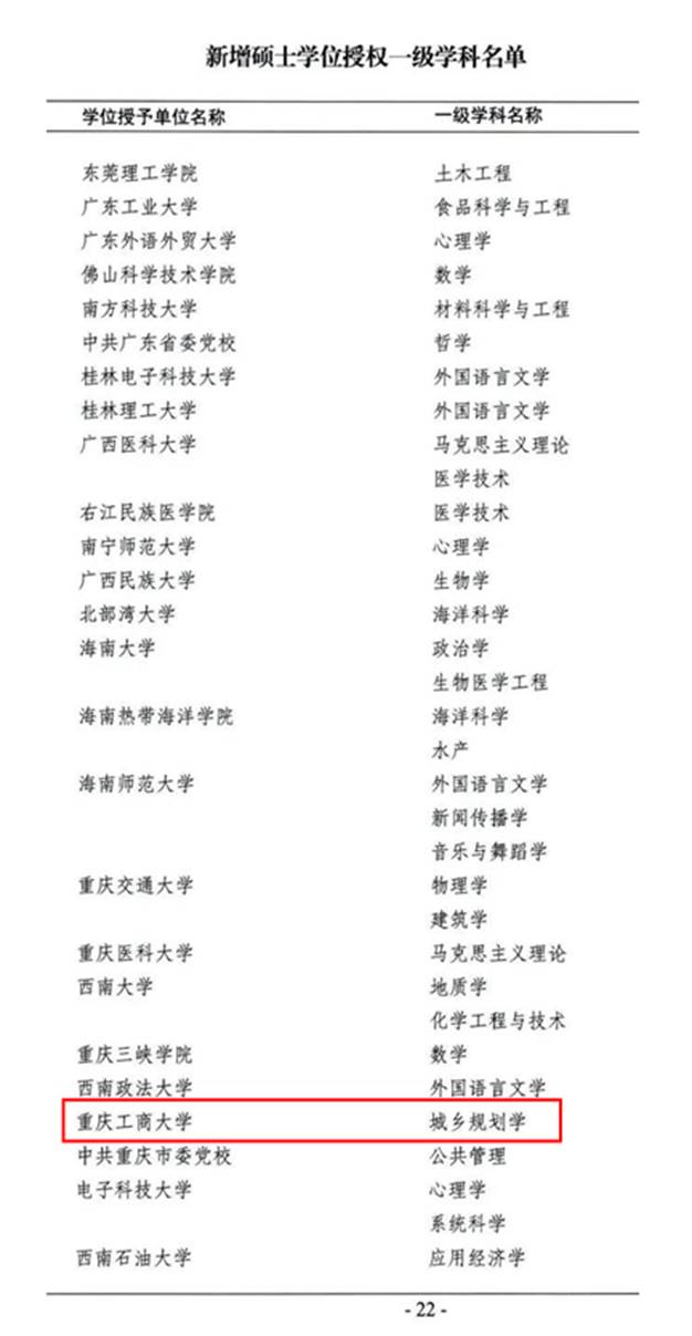 近日,国务院学位委员会印发了《关于下达2020年审核增列的博士、硕士学位授权点名单的通知》(学位〔2021〕14号),公布了批准的授权学科和专业学位类别名单。其中,我校新增城乡规划学1个一级学科硕士点,保险、翻译、电子信息、机械、资源与环境、旅游管理和工程管理7个专业学位硕士点,获批数量为重庆市第一。