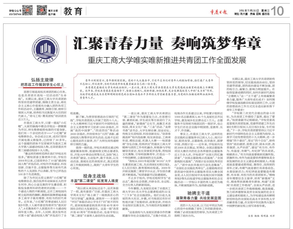 11月28日,在我校第二次团代会、学代会召开之际,《重庆日报》以“汇聚青春力量 奏响筑梦华章”为题,教育版半版报道了我校共青团在推进思想引领,“第二课堂”建设,“打造五有共青团”的发展蓝图等方面开展的具体工作及取得的成果,高度肯定了学校共青团的工作实效及“立德树人”的显著成效。