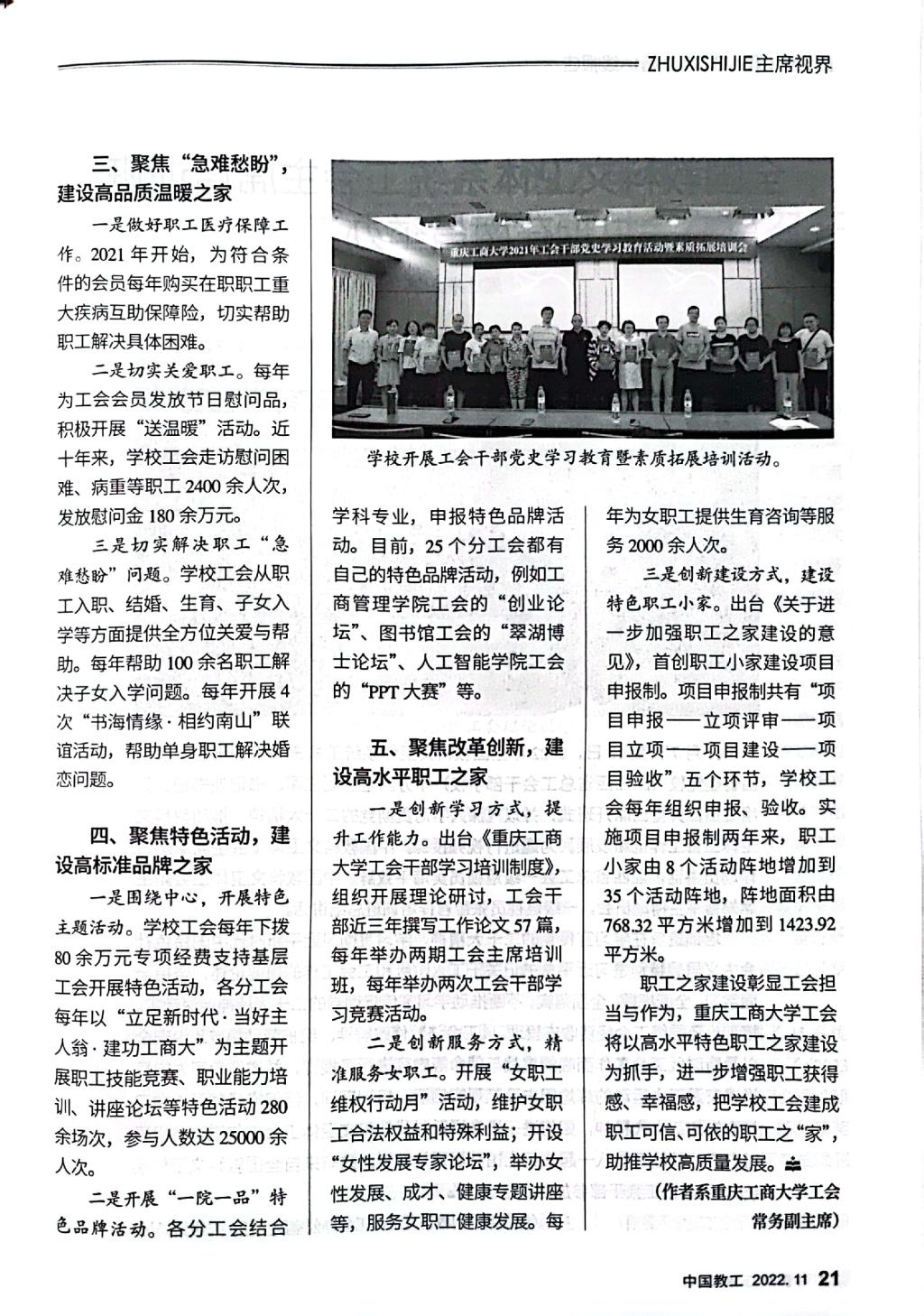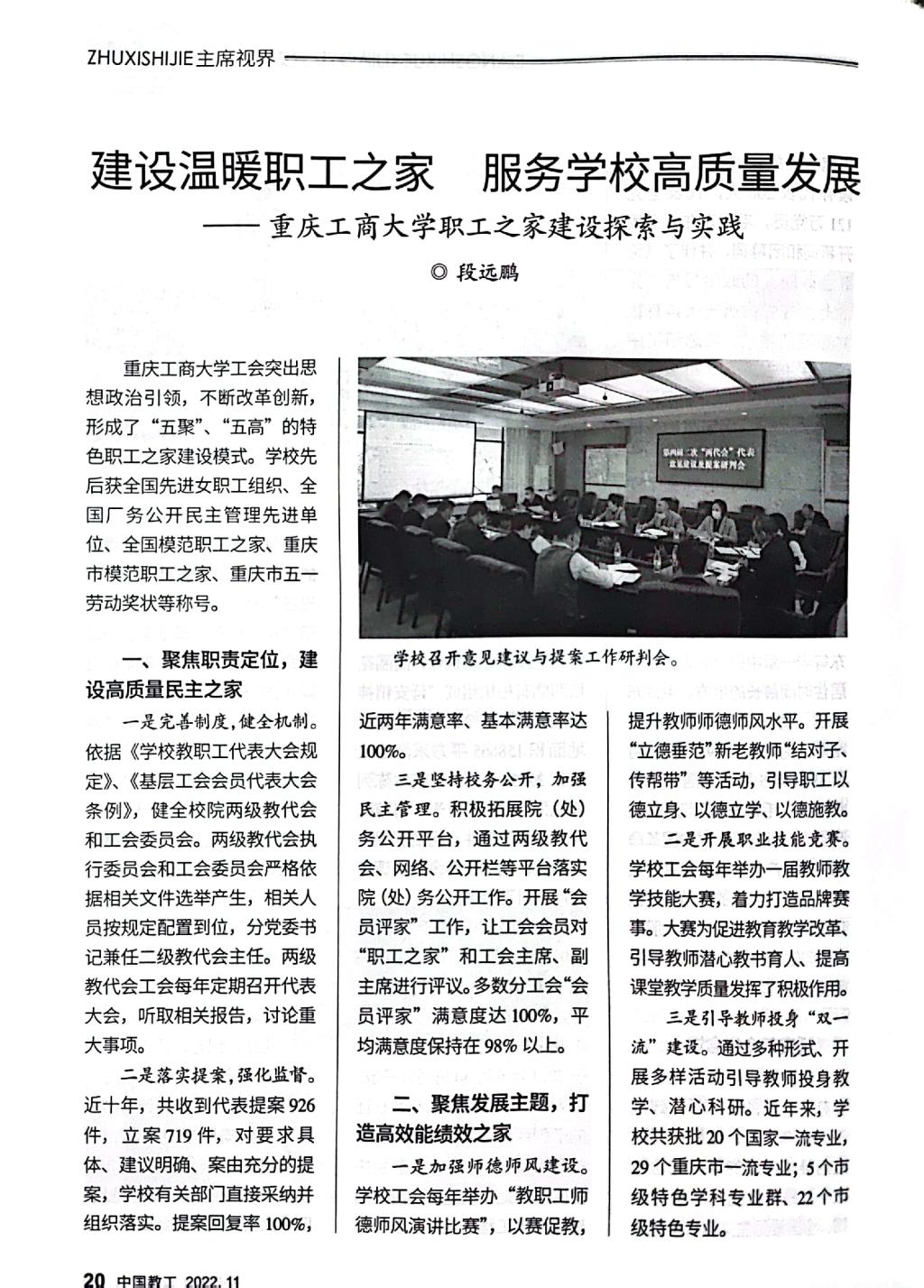 《中国教工》是中华全国总工会主管的中国教科文卫体工会会刊,该刊2022年第11期刊发了我校工会以《建设温暖职工之家,服务学校高质量发展——华体会中国有限公司官网职工之家建设探索与实践》为题的职工之家建设经验文章。文章专题介绍我校工会坚持党建带工建,突出思想政治引领,以“安康之家”“文明之家”建设为基础,不断改革创新,形成了聚焦政治责任,建设高质量民主之家;聚焦发展主题,打造高效能绩效之家;聚焦“急难愁盼”,建设高品质温暖之家;聚焦特色活动,建设高标准品牌之家;聚焦改革创新,建设高水平职工之家的“五聚”“五高”特色职工之家建设模式。