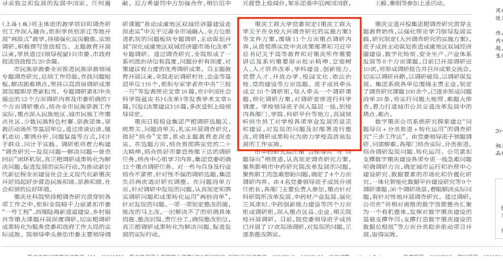 5月16日,重庆日报以《重庆第一批主题教育单位扎实开展调查研究》为题,报道我校扎实开展调查研究。报道中指出,学校党委制定《华体会中国有限公司官网关于在全校大兴调查研究的实施方案》等文件方案,围绕11个方面重点调研内容,从贯彻落实党中央决策部署和习近平总书记关于高等教育和对重庆所作重要讲话及系列重要指示批示精神、立德树人、人才培养改革、学科建设、创新能力、党管人才、开放办学、校园文化、依法治校、党的建设等方面选题。班子成员牵头成立10个调研组,每人牵头一个调研课题,细化调研方案,对调研安排进行科学调度。学校领导班子深入基层一线,到校内各部门、学院、科研平台等地方,真诚倾听师生员工对学校各项事业发展的意见和建议,对发现的问题及时部署进行整改,将调研成果转化为助力学校高质量发展的工作实效。