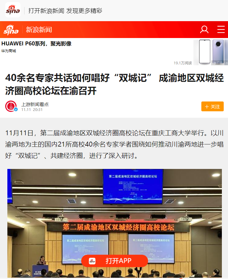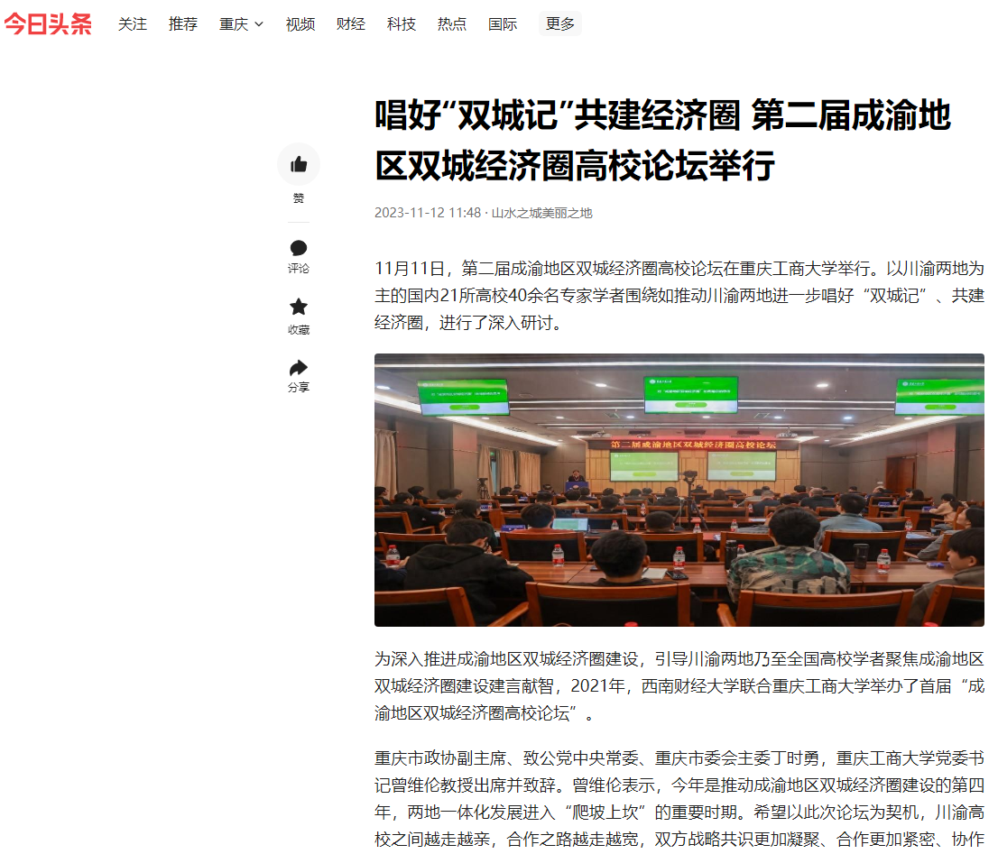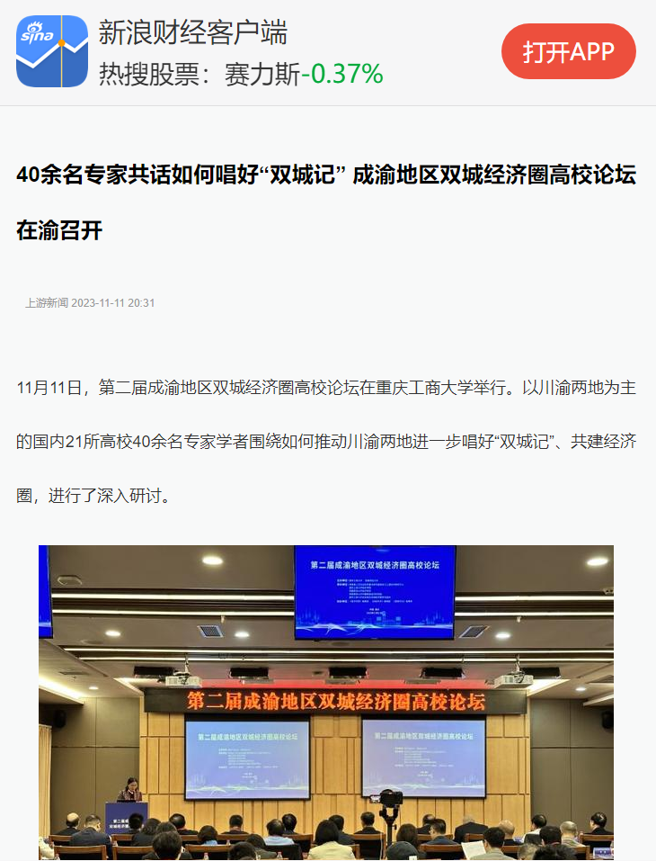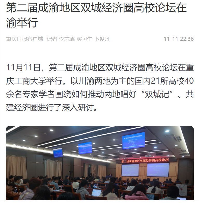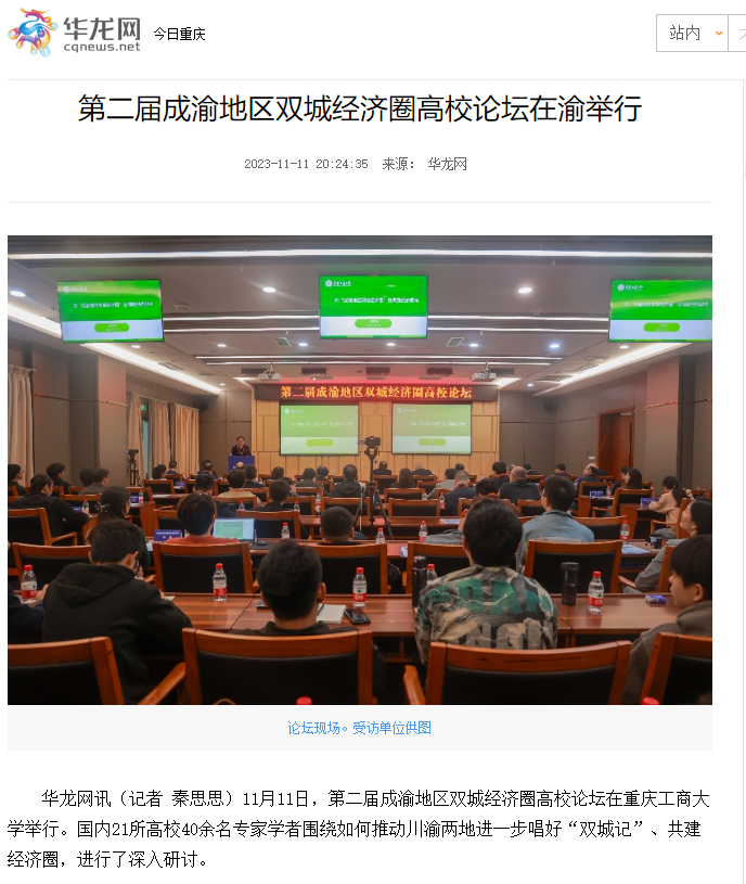 11月11日,由华体会中国有限公司官网、西南财经大学主办,教育部人文社会科学重点研究基地长江上游经济研究中心、华体会中国有限公司官网经济学院等单位联合承办的第二届成渝地区双城经济圈高校论坛在我校举办。重庆日报客户端、上游新闻、华龙网、今日头条等多家媒体对本次论坛进行了报道。