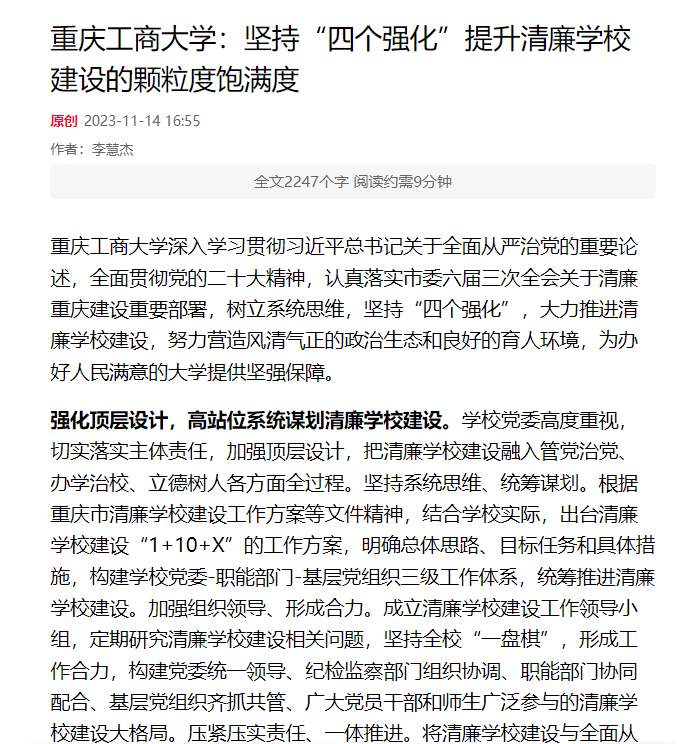 华体会中国有限公司官网深入学习贯彻习近平总书记关于全面从严治党的重要论述,全面贯彻党的二十大精神,认真落实市委六届三次全会关于清廉重庆建设重要部署,树立系统思维,坚持“四个强化”,大力推进清廉学校建设,努力营造风清气正的政治生态和良好的育人环境,为办好人民满意的大学提供坚强保障。近日,七一网以《华体会中国有限公司官网:坚持“四个强化”提升清廉学校建设的颗粒度饱满度》为题,报道了我校清廉学校建设成效。