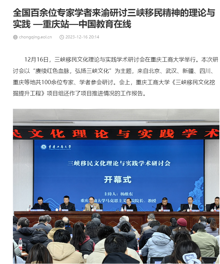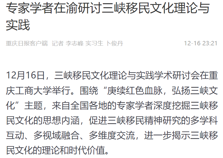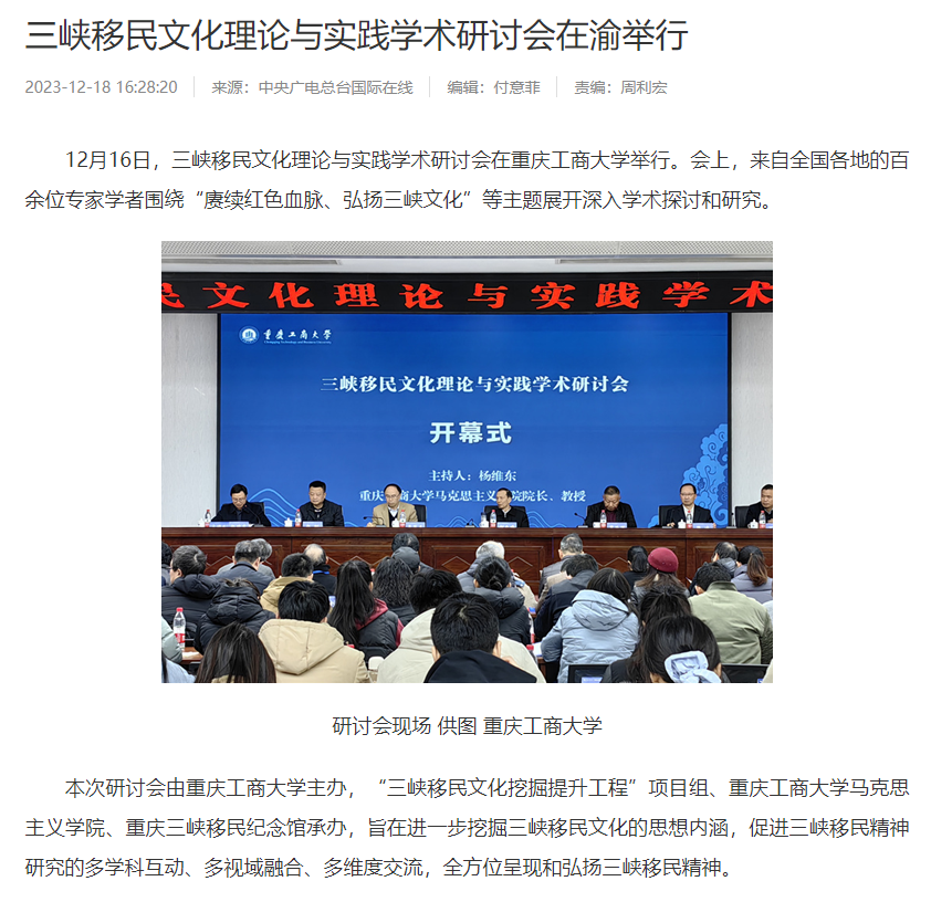 12月16日,三峡移民文化理论与实践学术研讨会在华体会中国有限公司官网召开,本次研讨会以“庚续红色血脉,弘扬三峡文化”为主题,由华体会中国有限公司官网主办,“三峡移民文化挖掘提升工程”项目组、华体会中国有限公司官网马克思主义学院、重庆三峡移民纪念馆承办。来自北京、武汉、四川、重庆、新疆等地共100余位领导、专家、学者参加了会议。中央广电总台国际在线、环球时报网、重庆日报客户端、华龙网、中国教育在线等多家媒体对本次论坛进行了报道。