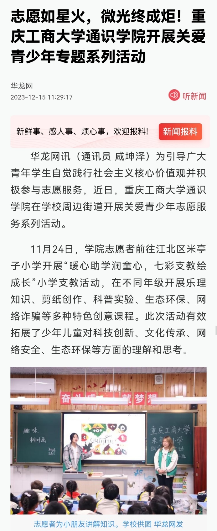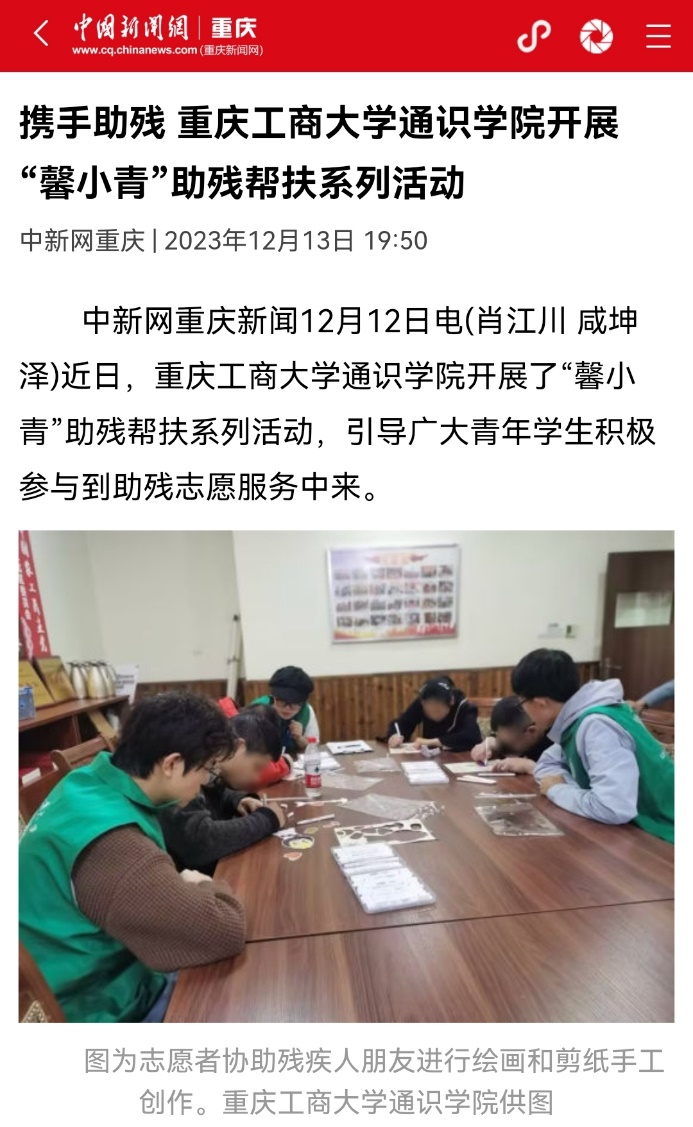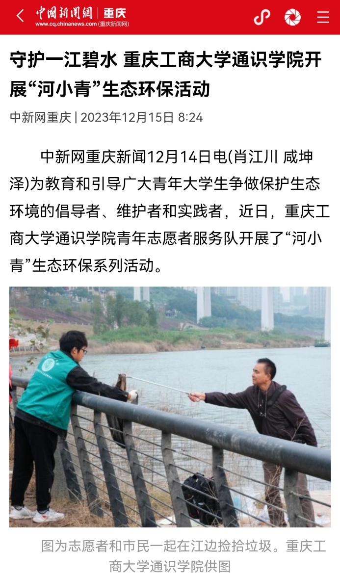 近日,中国新闻网以《守护一江碧水 华体会中国有限公司官网通识学院开展“河小青”生态环保活动》《携手助残 华体会中国有限公司官网通识学院开展“馨小青”助残帮扶系列活动》为题,报道我校通识学院开展生态环保及助残志愿服务活动;华龙网以《志愿如星火,微光终成炬!华体会中国有限公司官网通识学院开展关爱青少年专题系列活动》为题,报道我校通识学院开展关爱青少年志愿服务活动。