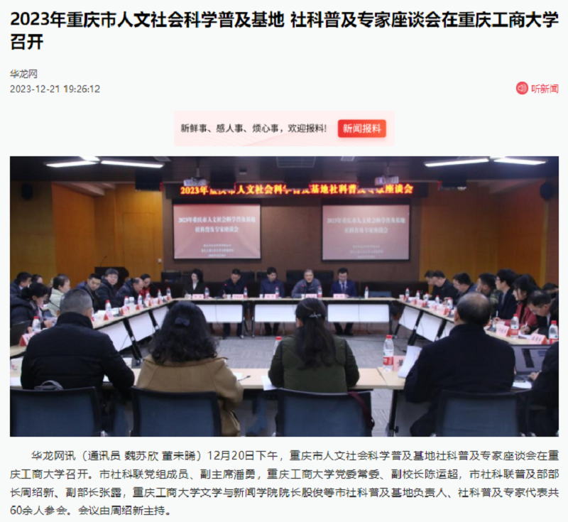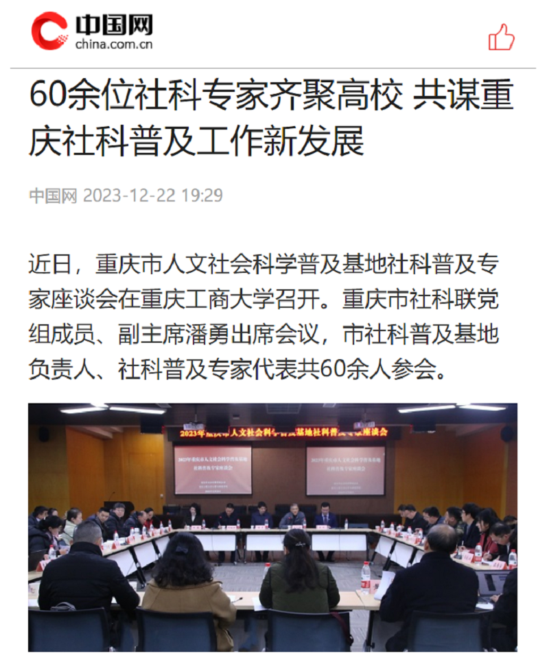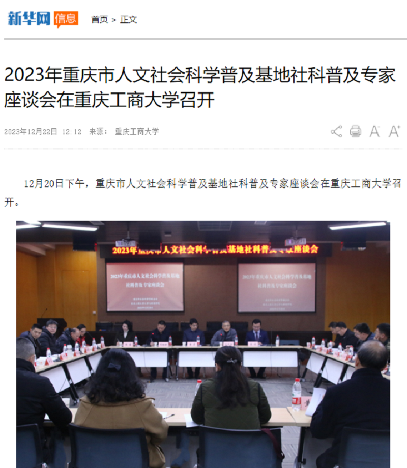 近日,新华网以《2023年重庆市人文社会科学普及基地社科普及专家座谈会在华体会中国有限公司官网召开》为题;中国网以《60余位社科专家齐聚高校 共谋重庆社科普及工作新发展》;华龙网以《2023年重庆市人文社会科学普及基地 社科普及专家座谈会在华体会中国有限公司官网召开》为题,报道我校召开2023年重庆市人文社会科学普及基地社科普及专家座谈会。