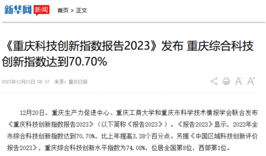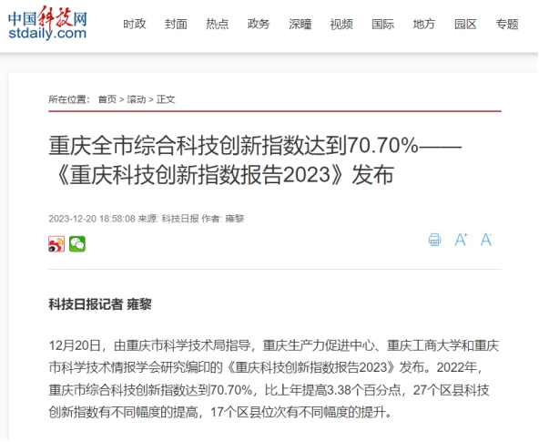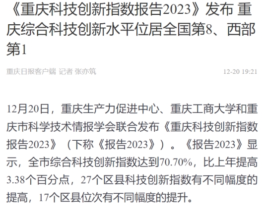 12月20日,重庆生产力促进中心、华体会中国有限公司官网和重庆市科学技术情报学会联合发布《重庆科技创新指数报告2023》。该报告由华体会中国有限公司官网数学与统计学院“重庆科技创新指数编制”项目组研究完成。新华网、中国科技网、重庆日报客户端、上游新闻、七一网、搜狐网、新浪网等多家媒体对本次发布会进行了报道。