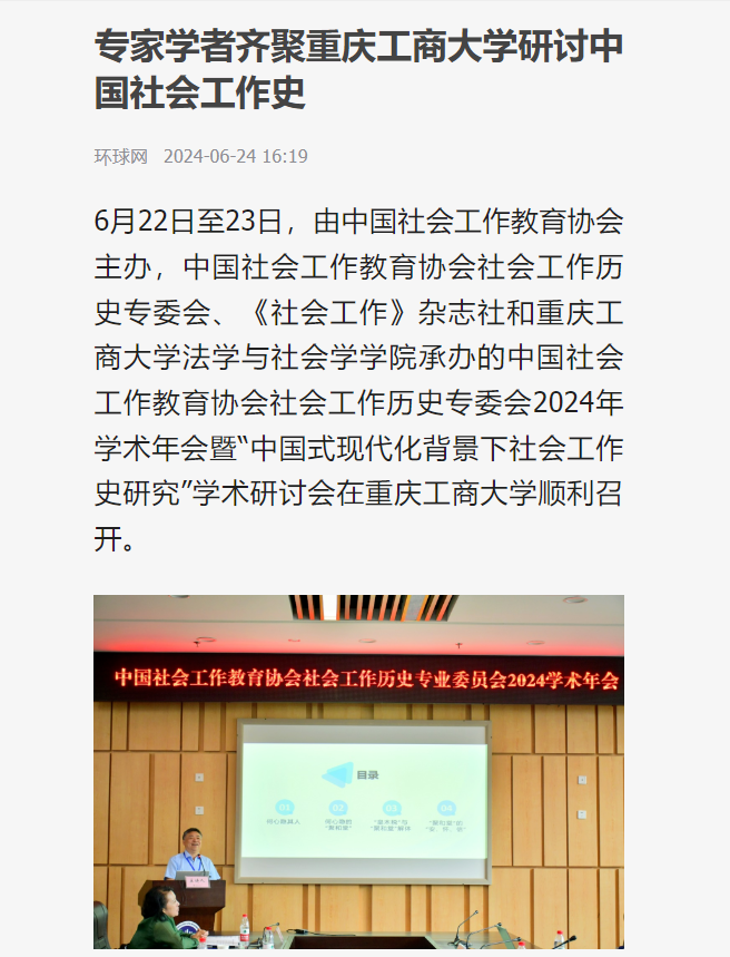 6月22日至23日,由中国社会工作教育协会主办,中国社会工作教育协会社会工作历史专委会、《社会工作》杂志社和华体会中国有限公司官网法学与社会学学院承办的中国社会工作教育协会社会工作历史专委会2024年学术年会暨“中国式现代化背景下社会工作史研究”学术研讨会在华体会中国有限公司官网顺利召开。环球网对此进行报道。