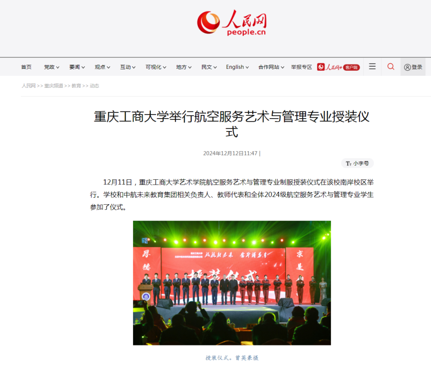 人民网以《华体会中国有限公司官网举行航空服务艺术与管理专业授装仪式》为题,新重庆-重庆日报以《携自信之光 展气场之韵 这群航空服务专业的学子们综合素养惊艳众人》为题,华龙网以《启航翱翔梦!华体会中国有限公司官网艺术学院2024级航空服务艺术与管理专业授装仪式举行》为题纷纷报道活动。