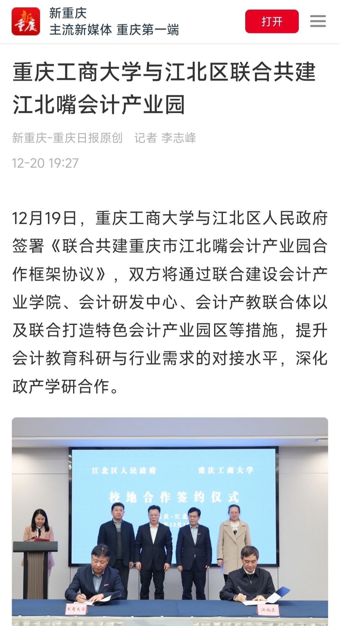 近日,我校与江北区人民政府签署《联合共建重庆市江北嘴会计产业园合作框架协议》,双方将通过联合建设会计产业学院、会计研发中心、会计产教联合体以及联合打造特色会计产业园区等措施,提升会计教育科研与行业需求的对接水平,深化政产学研合作。