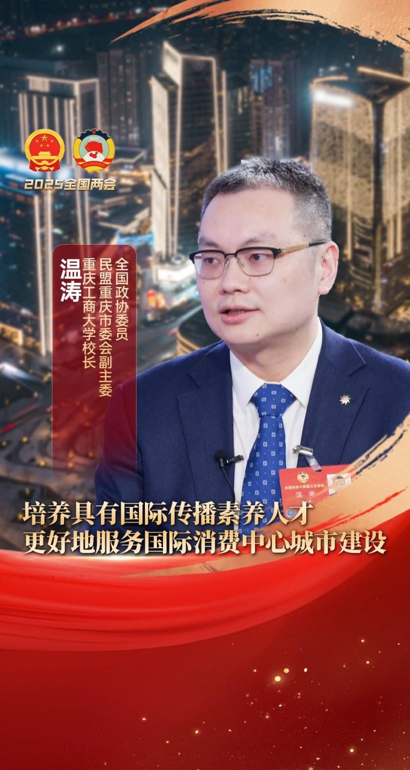 3月8日,住渝全国政协委员举行“持续扩大国际消费中心城市影响力吸引力”专题记者会。全国政协委员、民盟中央委员、重庆市委会副主委、我校校长温涛在做客重庆广电第一眼TV时表示,要致力于培养具有国际视野、具有跨文化沟通能力、具有国际传播素养,以及具有数字胜任力的创新性人才。