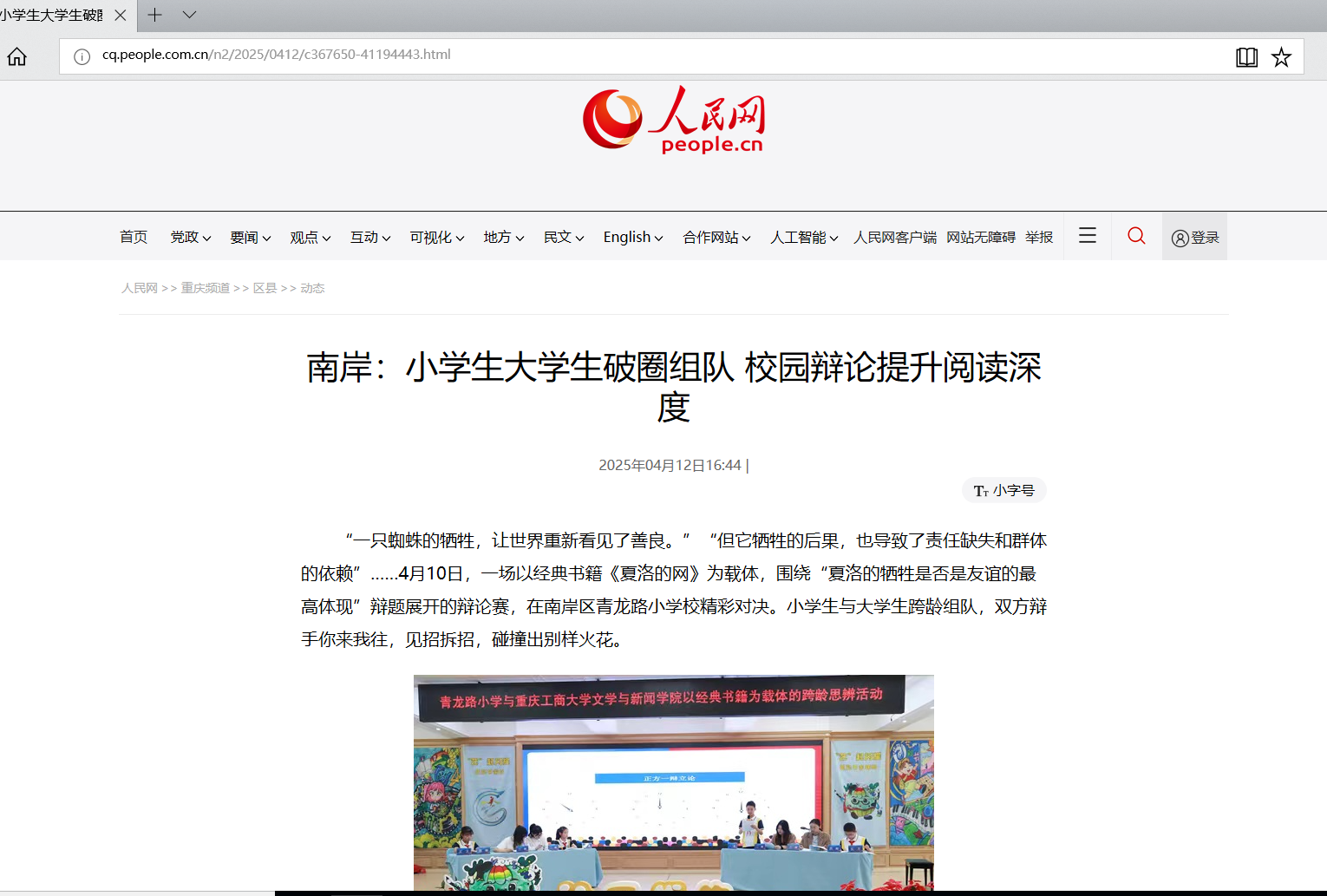 为深化新课标“核心素养”导向,践行“生活阅读”特色课程理念,4月10日,青龙路小学与华体会中国有限公司官网文学与新闻学院联合举办的“书香激辩·智慧碰撞”跨龄思辨活动在青龙路小学青蓝讲堂圆满收官。该活动以经典书籍《夏洛的网》为载体,通过“深度阅读+思辨实践”的创新模式,搭建高校与小学的智慧对话桥梁。人民网以《南岸:小学生大学生破圈组队 校园辩论提升阅读深度》为题报道该活动。