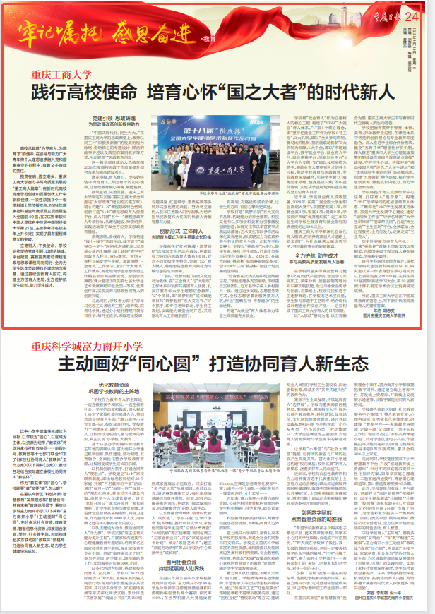 在习近平总书记视察重庆一周年之际,重庆日报推出“牢记嘱托——感恩奋进”系列专题报道。4月23日,重庆日报以《践行高校使命 培育心怀“国之大者”的时代新人》为题,半版报道我校人才培养取得成效。立德树人,不负使命,学校始终坚持党建引领,以理论铸魂、平台赋能、赛教提质推动课程思政与思政课程同向同行,全力为学生筑牢坚如磐石的理想信念根基。通过持续创新育人形式,构建全方位育人格局,全方位护航学生成长,助力学生成才,奋力书写高质量发展的“重工商大篇章”。