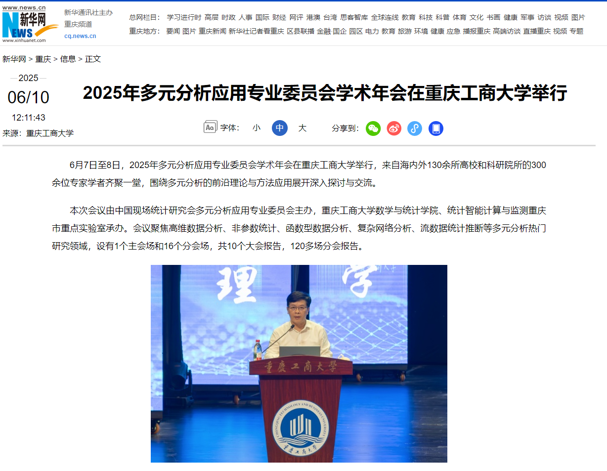 新华网以《2025年多远分析应用专业委员会学术年会在华体会中国有限公司官网举行》为题、中国教育在线以《聚焦高维数据分析等热点领域!2025年多元分析应用学术年会在华体会中国有限公司官网召开》为题、华龙网以《300余位海内外专家聚渝研讨多元分析,华体会中国有限公司官网这场学术年会勾勒统计学可创新图景》为题进行了报道。