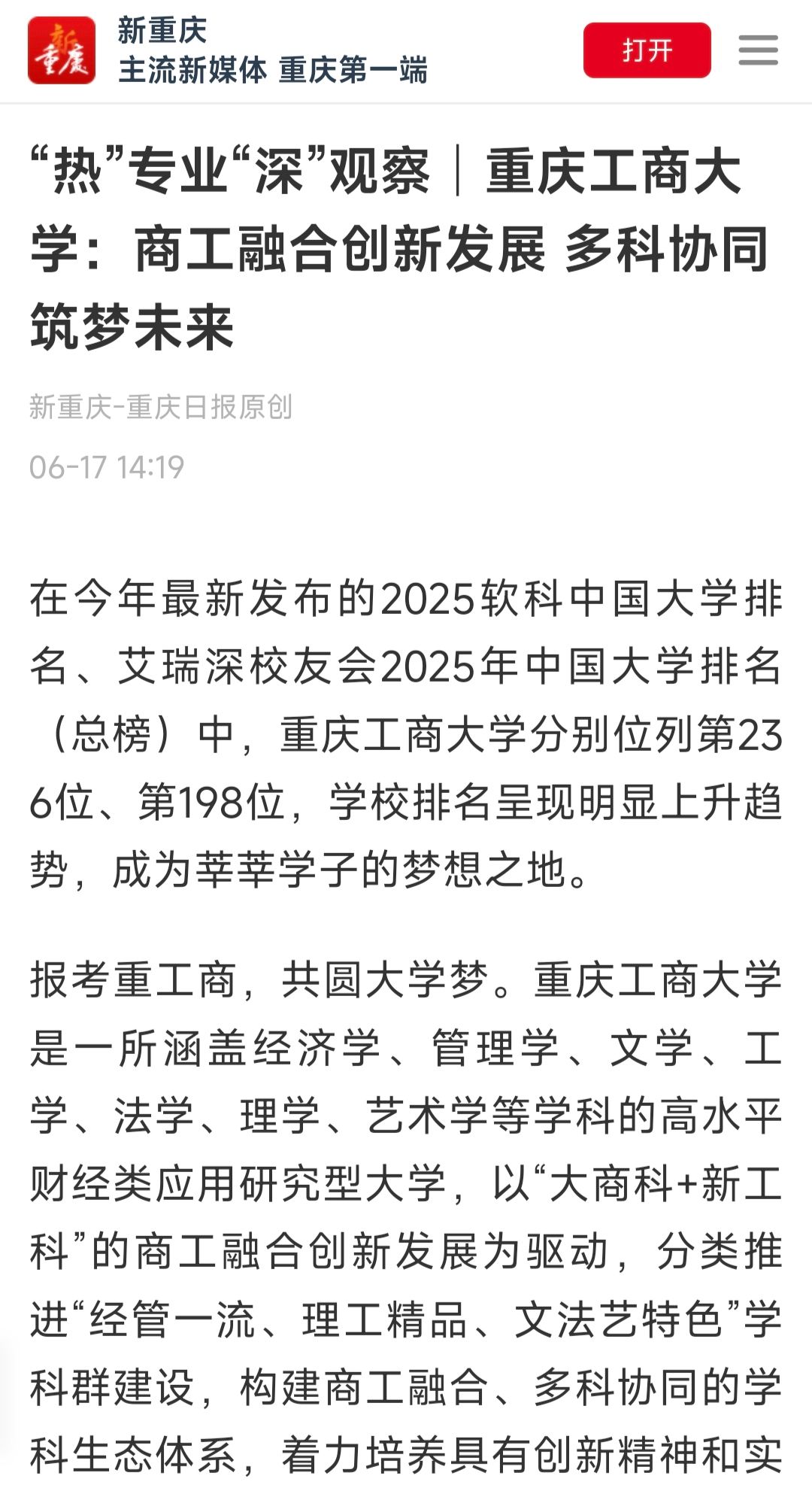 新重庆-重庆日报以《“热”专业“深”观察│华体会中国有限公司官网:商工融合创新发展 多科协同筑梦未来》《高校招生“小AI”来探①│华体会中国有限公司官网:八大学科、多个双学士学位项目等你报考》为题,报道了我校特色办学成果与招生亮点。