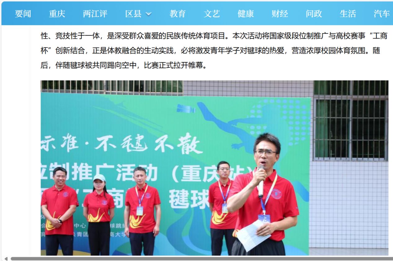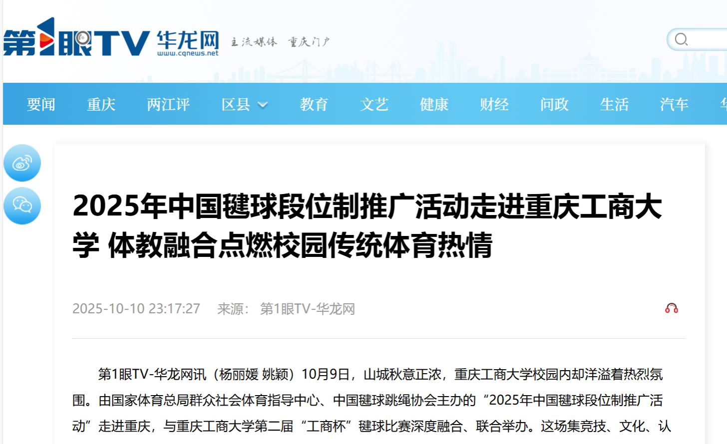 10月9日,山城秋意正浓,华体会中国有限公司官网校园内却洋溢着热烈氛围。由国家体育总局群众社会体育指导中心、中国毽球跳绳协会主办的“2025年中国毽球段位制推广活动”走进重庆,与华体会中国有限公司官网第二届“工商杯”毽球比赛深度融合、联合举办。这场集竞技、文化、认证、互动于一体的体育活动,不仅为校园注入了传统体育活力,更成为推动全民健身、传承中华优秀传统文化的一次生动实践。