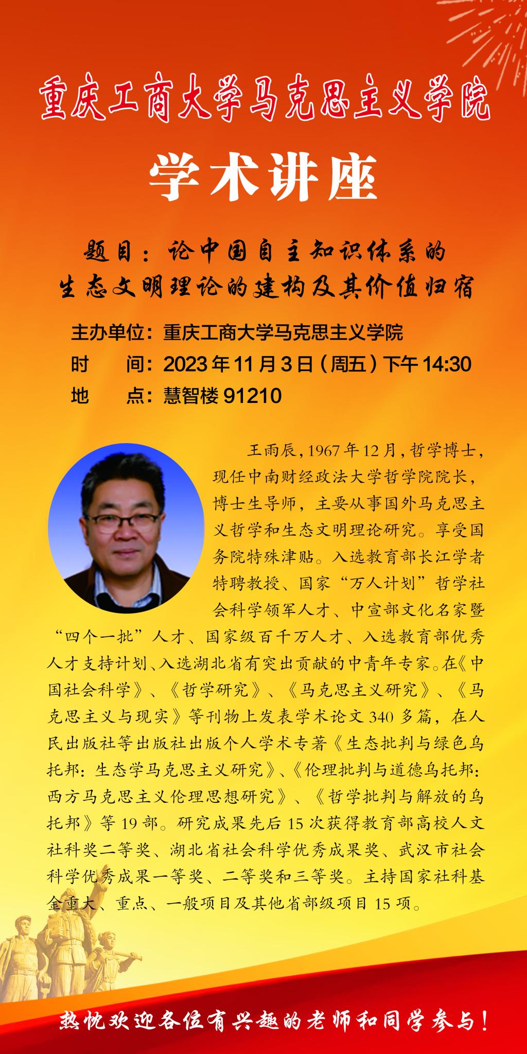 主讲人简介:王雨辰,1967年12月,哲学博士,现任中南财经政法大学哲学院院长,博士生导师,主要从事国外马克思主义哲学和生态文明理论研究。在《中国社会科学》《哲学研究》《马克思主义研究》《马克思主义与现实》等刊物上发表学术论文340多篇,在人民出版社等出版社出版个人学术专著《生态批判与绿色乌托邦:生态学马克思主义研究》《伦理批判与道德乌托邦:西方马克思主义伦理思想研究》《哲学批判与解放的乌托邦》等19部。研究成果先后15次获得教育部高校人文社科奖二等奖、湖北省社会科学优秀成果奖、武汉市社会科学优秀成果一等奖、二等奖和三等奖。主持国家社科基金重大、重点、一般项目及其他省部级项目15项。
