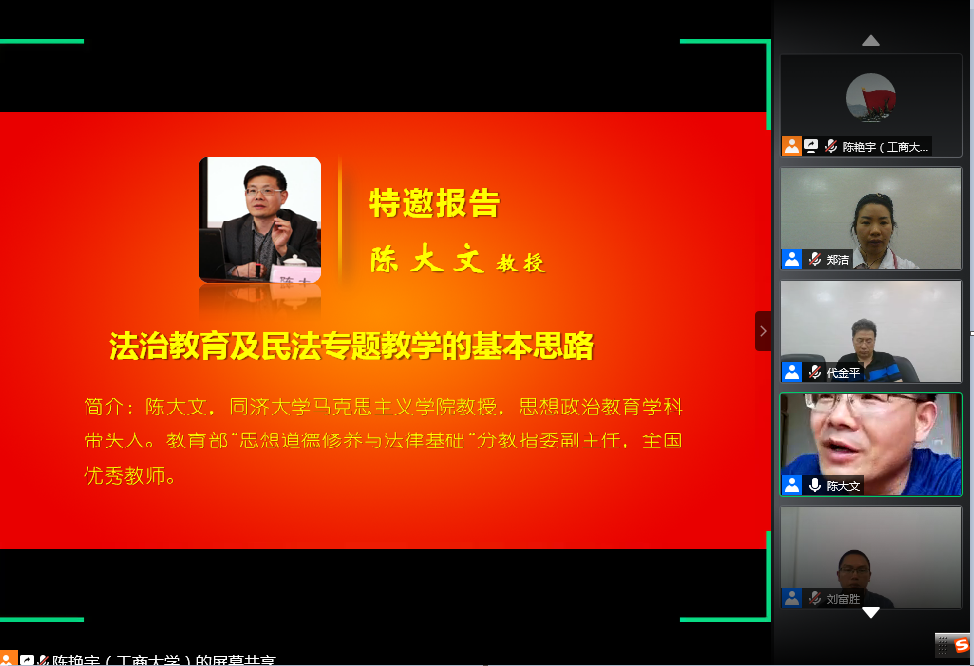 本次集体备课会主题为“如何将民法典精神原则融入‘思想道德修养与法律基础’课教学”。会议特邀同济大学马克思主义学院教授、思想政治教育学科带头人、教育部"思想道德修养与法律基础"分教指委副主任、全国优秀教师陈大文教授作了题为《法治教育及民法专题教学的基本思路 》的专题报告。陈大文教授指出,“基础”课法治教育及民法专题的教学目标是将道德与法律有机结合,按照大中小一体化思路构建青少年的法治观。在教学中要讲清三点:一要讲清民法典特色要求,二要讲清原则精神,三要讲清创新体系。陈教授在报告中为大家详细梳理了开展专题教学的基本思路及对应的教学要点。
