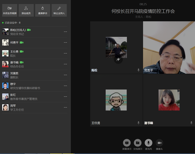 为进一步做好疫情防控和学院相关工作,马克思主义学院根据分管校领导何勇平副校长的要求,于2020年3月15日上午通过企业微信平台召开了“统筹推进疫情防控和业务工作部署会”。学校疫情防控工作网格六组组长何勇平副校长、学院班子成员及全体行政人员参加了会议。会议由学院党总支书记陈松主持。