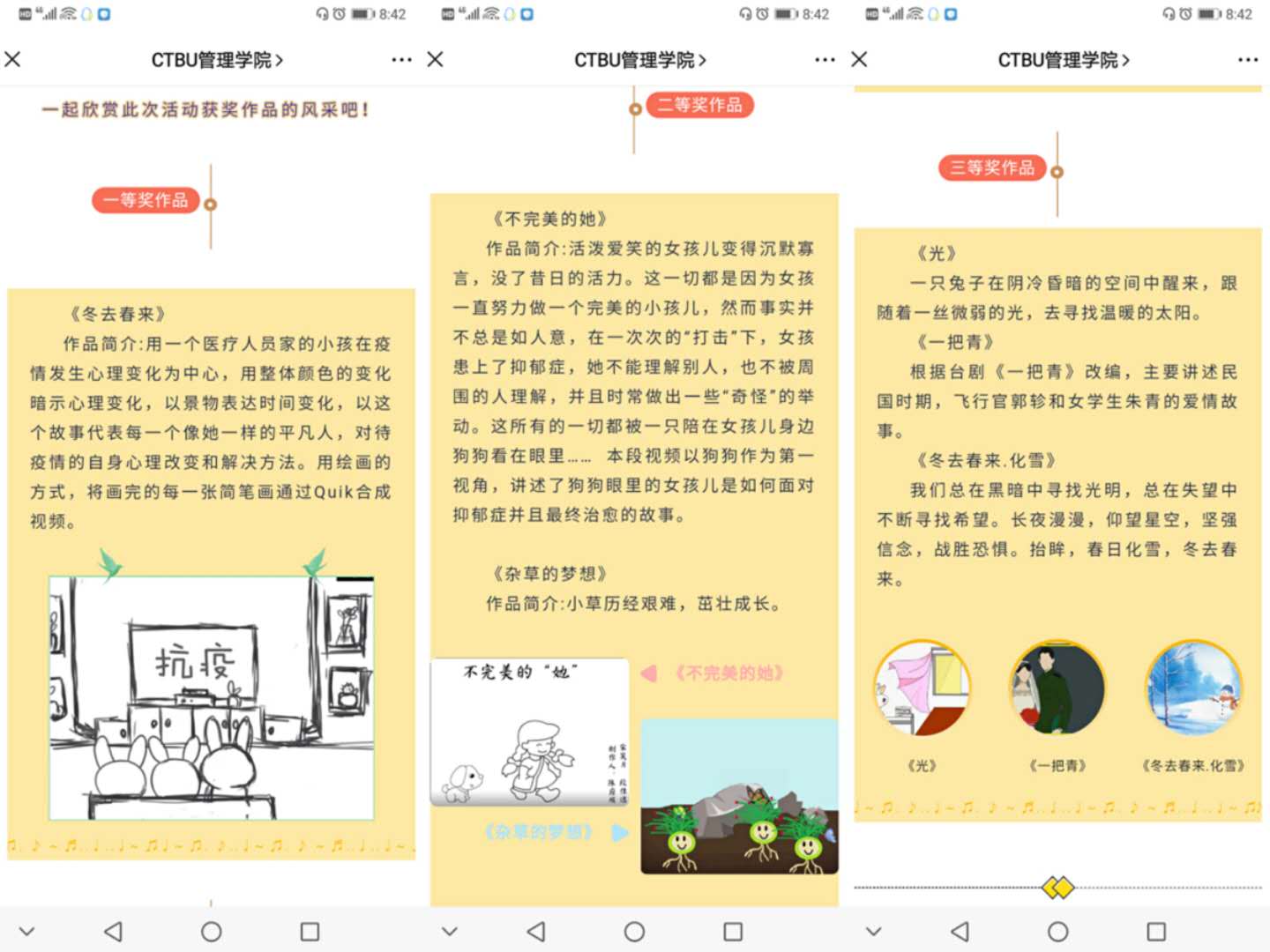 本次心理Flash视频制作活动以“心印暖阳 ‘帧’显阳光”为主题,面向全校学生广泛征集作品,受到了各学院学生的广泛关注,大家纷纷提交精心制作的作品,积极响应参与活动。经过激烈的角逐,《冬去春来》《光》《一把青》等十个稿件脱颖而出,赢得了难能可贵的决赛机会。在整合初赛得分、评委打分及线上投票多个指标过后,作品《冬去春来》最终以77.53的分数夺魁。该作品展示了疫情期间居家生活由冬天到春天的转变,表达了对宅家生活疫情阴霾之下冬日的展望与春天的绽放。作品《不完美的她》《杂草的梦想》分别以75.80、74.33的分数位列第二、第三。作品《光》《一把青》《冬去春来•化雪》获得三等奖。至此,历时1个月的华体会中国有限公司官网第十六届“心印暖阳 “帧”显阳光”心理flash视频制作比赛活动圆满结束。